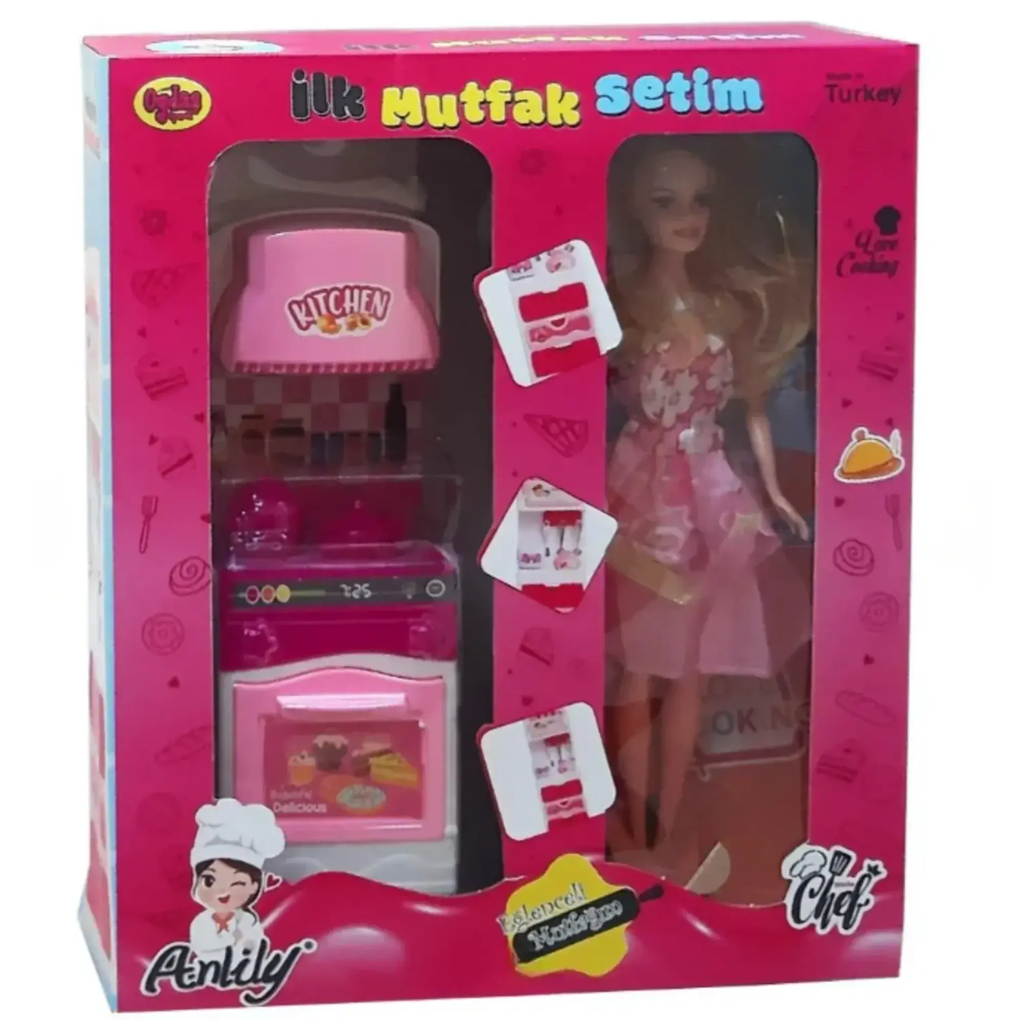 - İçerisinde kullanımı kolay fırın, çeşitli mutfak aksesuarları ve sevimli bir bebek bulunmaktadır.