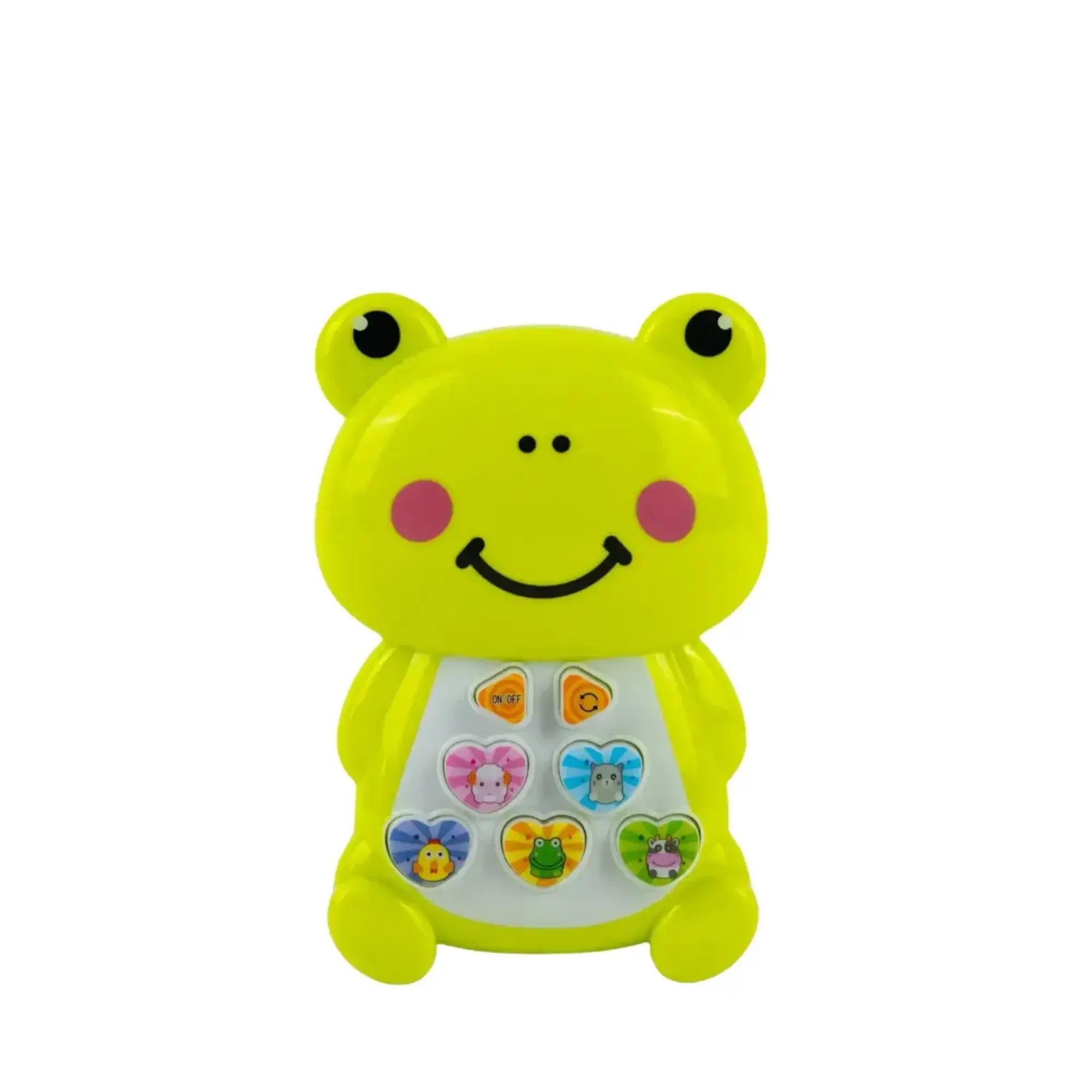 - Neşeli Kurbağa , sevimli tasarımı ve renkli tuşlarıyla bebeklerin ilgisini çekerken, 6 farklı hayvan sesiyle onları hem eğlendirir hem de hayvanları tanımalarını sağlar.