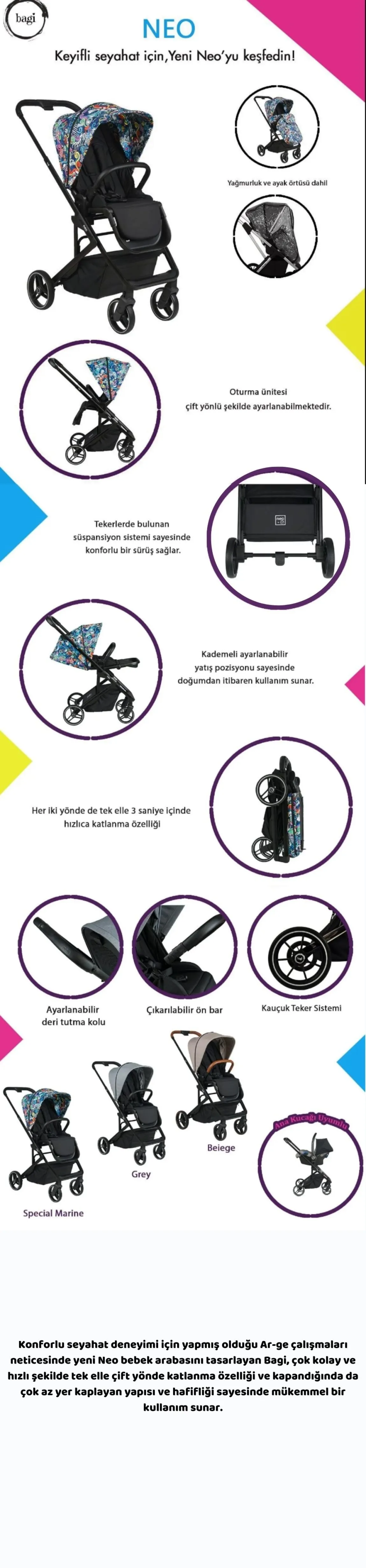 Konforlu seyahat deneyimi için yapmış olduğu Ar-ge çalışmaları neticesinde yeni Neo Big bebek arabasını tasarlayan Bagi, tek elle çift yönde katlanma özelliği ve kapandığında da çok az yer kaplayan yapısı sayesinde mükemmel bir kullanım sunar. Özel tekerlek yapısı ve süspansiyon özelliği ile mükemmel sürüş keyfi yaşatır.