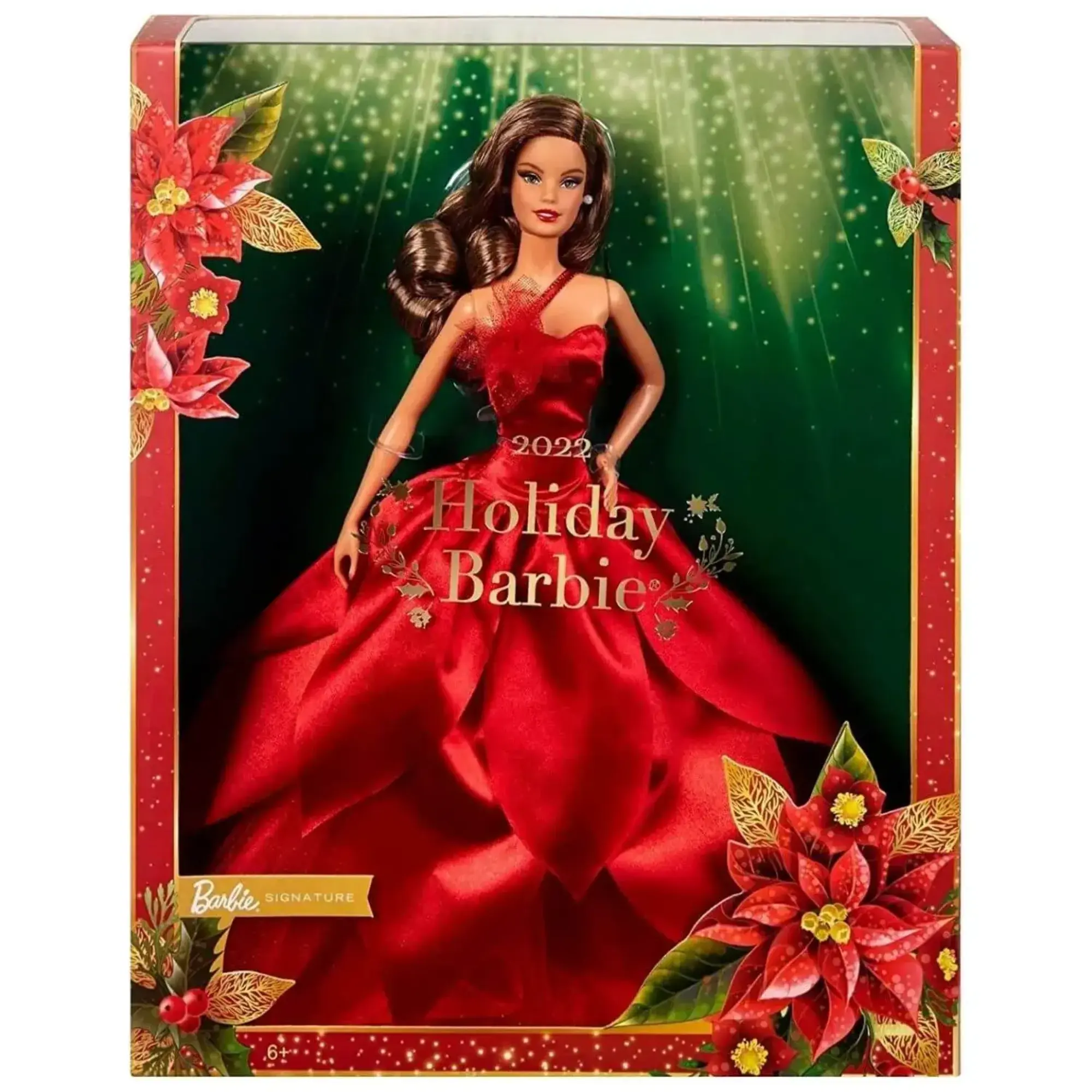 Barbie 2022 Mutlu Yıllar Bebeği, iyi niyet ve topluluk ruhunun sembolü olan göz alıcı ponsetya çiçeğinden ilham alınarak tasarlanan canlı, kırmızı elbiseyle yılbaşı sezonunun ruhunu yansıtıyor.