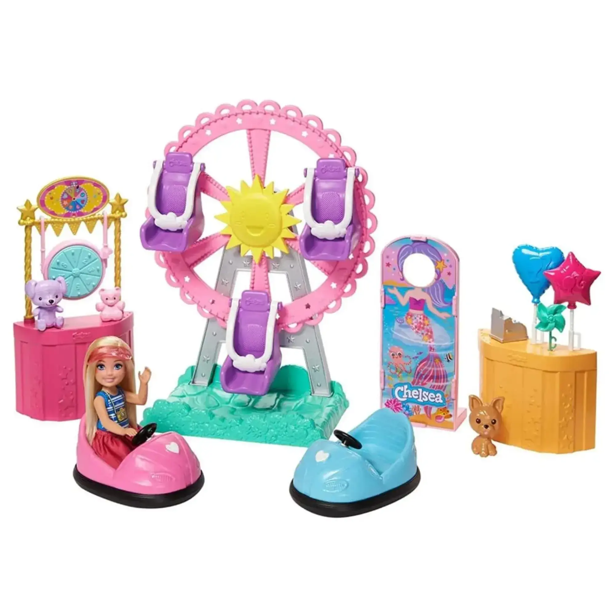 Beş oyun alanı, gerçek özellikli büyük parçaları ve evcil köpeği ile bu Barbie Club Chelsea Karnaval oyun seti ,sınırsız hikaye anlatma eğlencesi sunuyor.