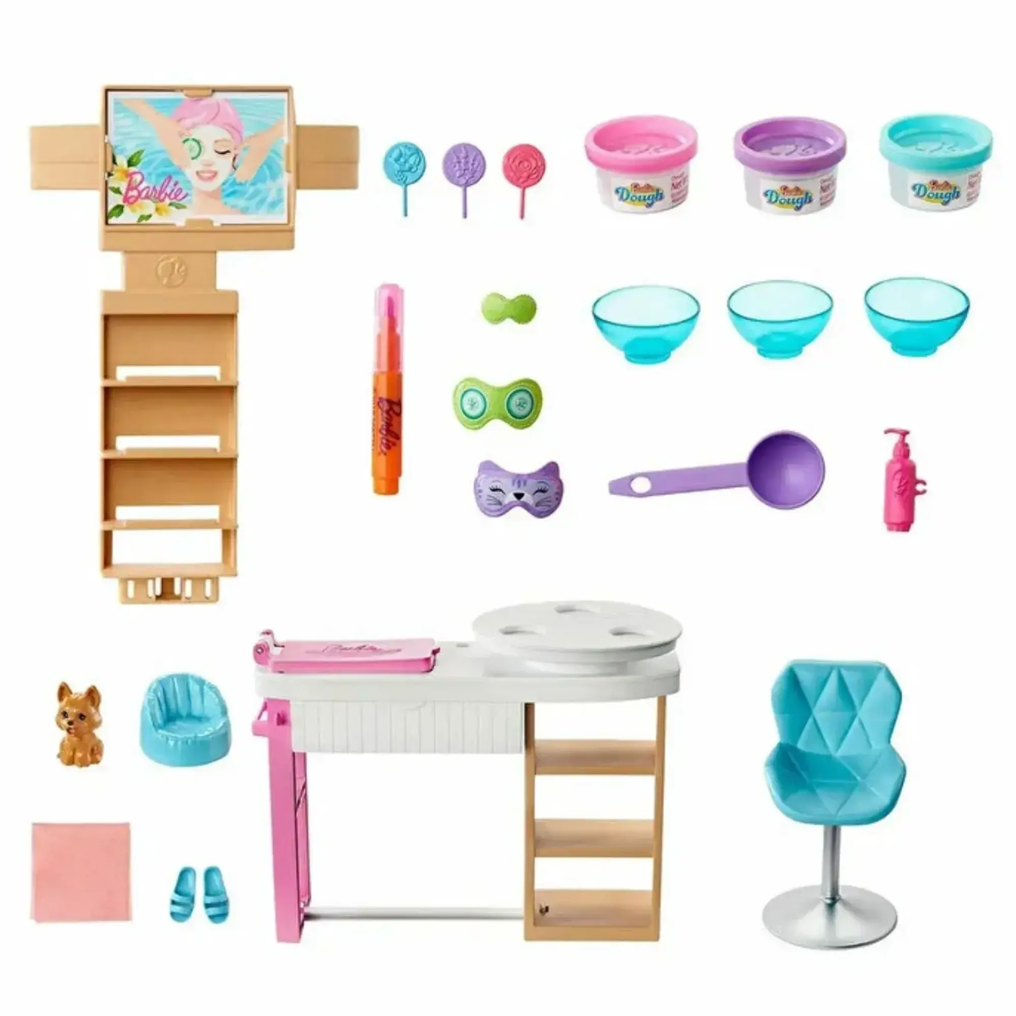 - Sette mayolu Barbie bebek, yavru köpeği, küvet, spa rafı, 5 paket köpük tozu ve rahatlatıcı bir banyo için gereken aksesuarlar bulunur.