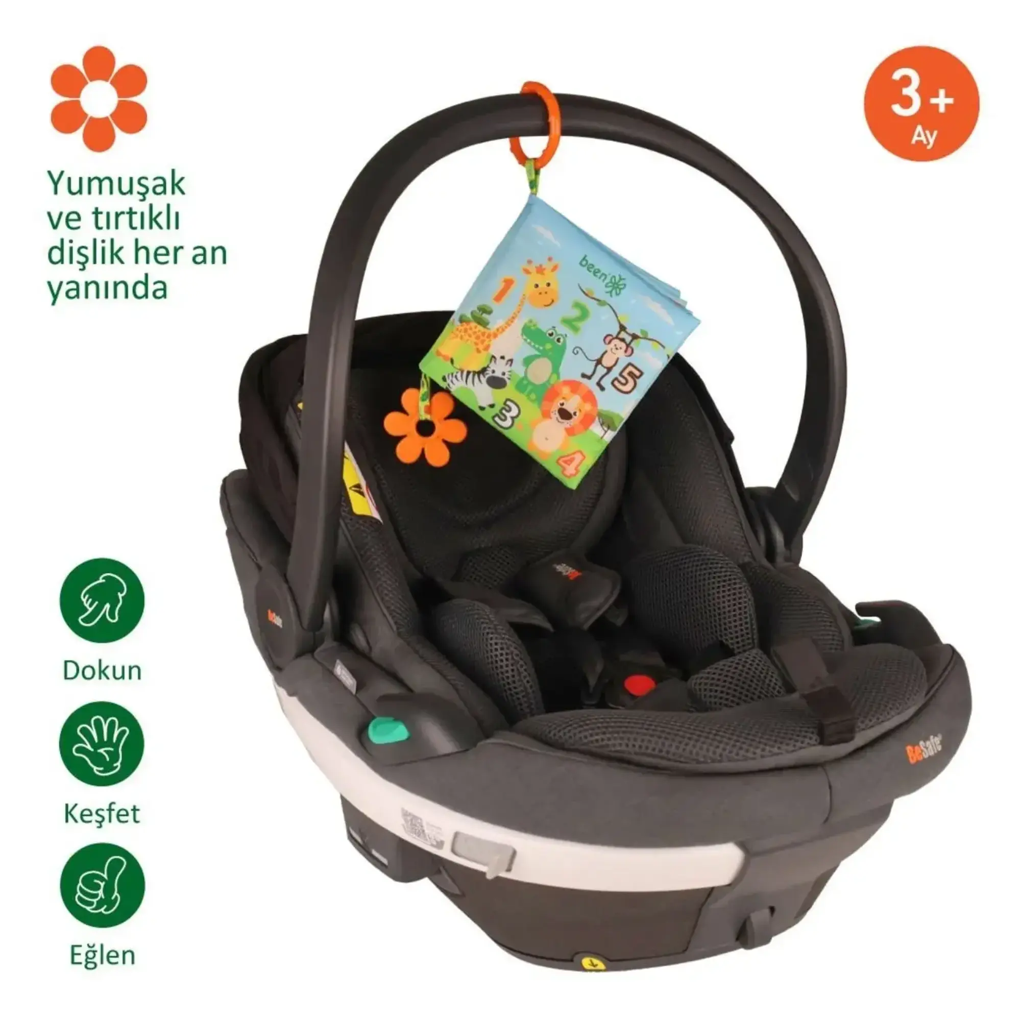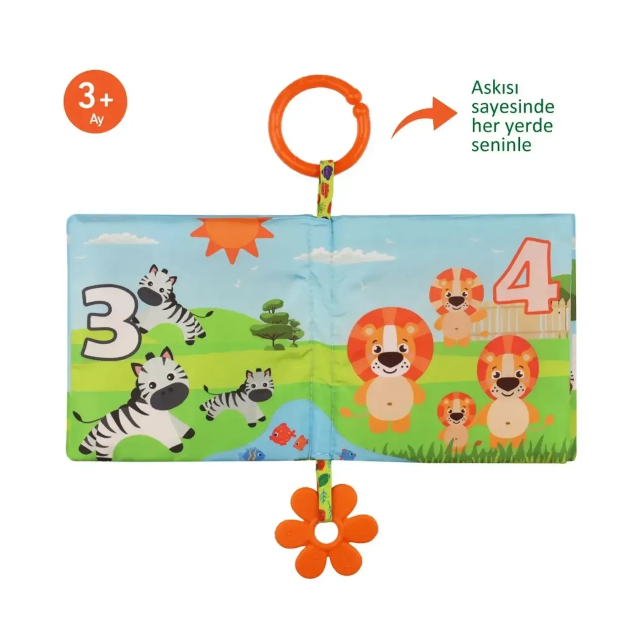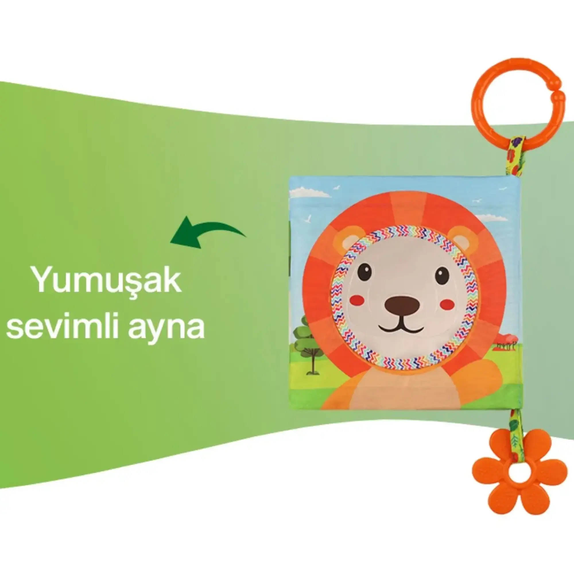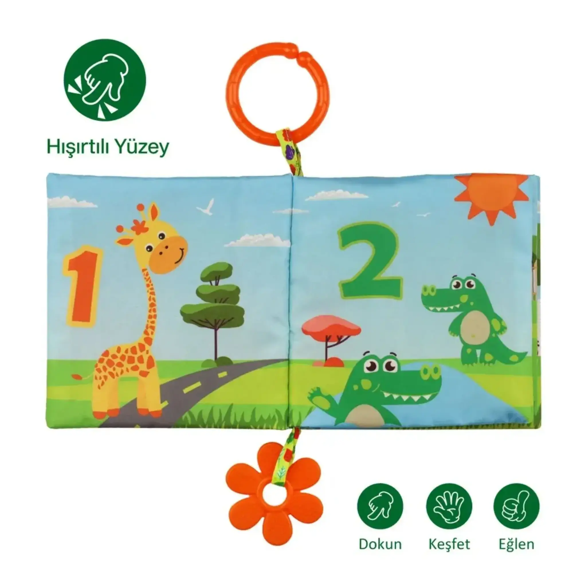 • Kitap üzerindeki yumuşak silikon dişlik, bebeğin diş etlerine masaj yaparak rahatlamasını sağlar.