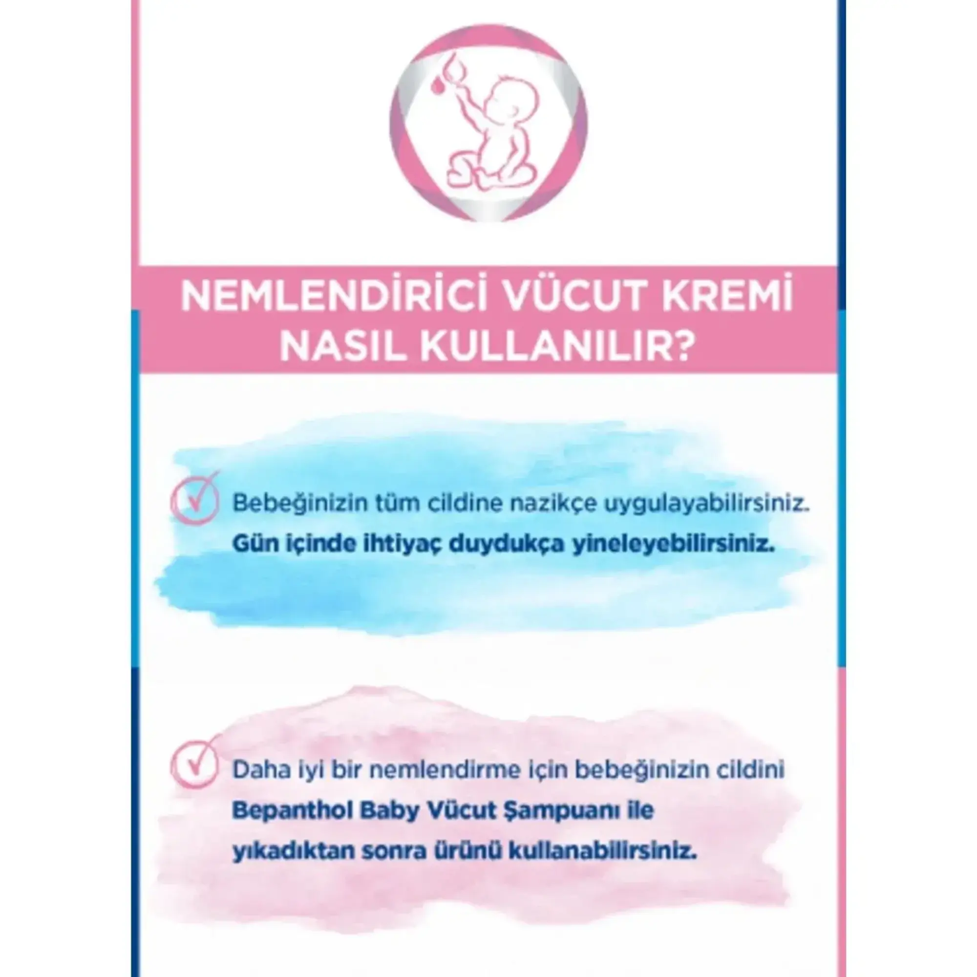 - Bepanthol Baby Nemlendirici Vücut Kremi, bebeğin cildinde anında ve uzun süreli nemlendirme sağlar.