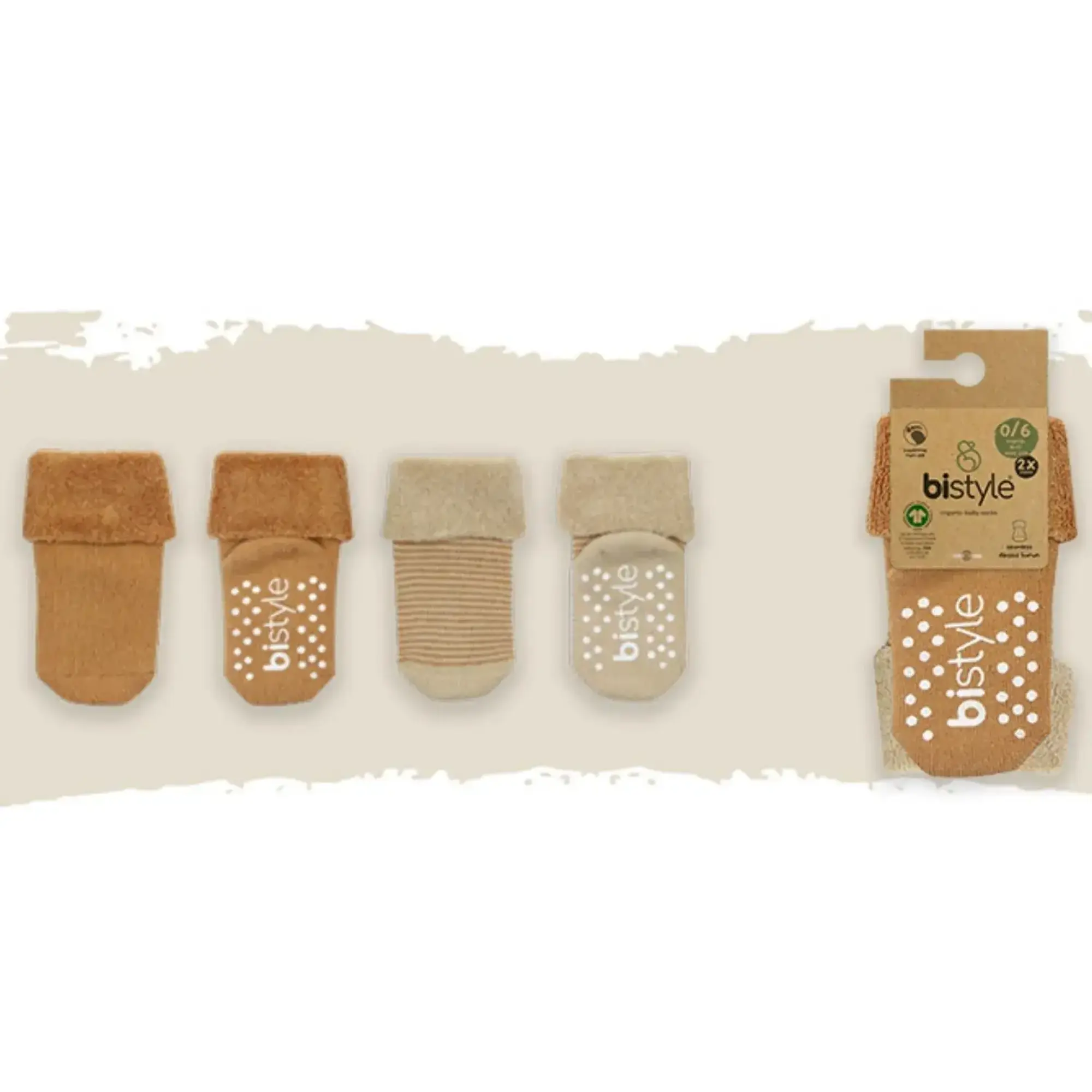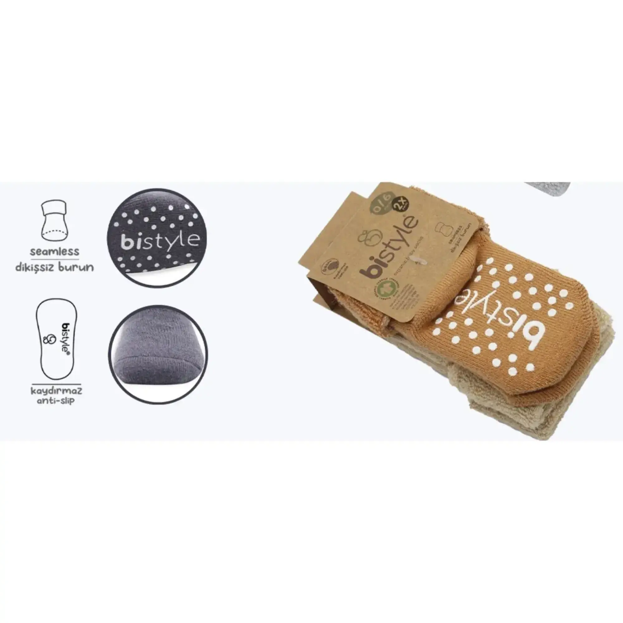 Bibaby Unisex Organik Çorap Soket Havlu 2Li Kaymaz Çemberli Kıvrık Bistyle Bej - Hardal