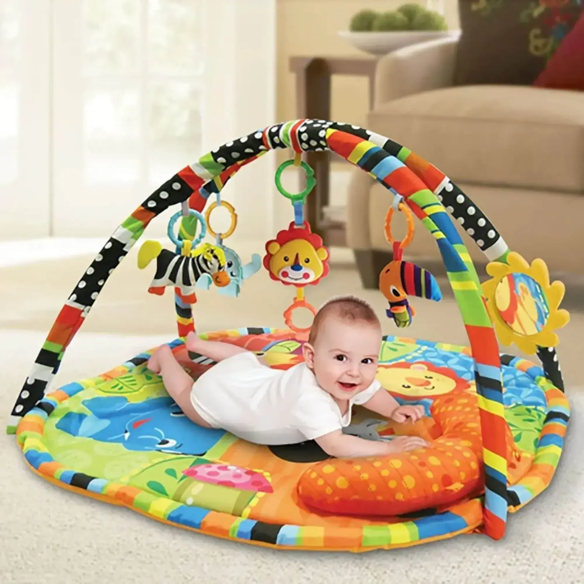 - Bebeğiniz halı üstünde yatıp oynayabilir; karın üstü yatarak eğlenebilir ve hışırdayan ayaklar ile kuyruğa sahip zebra, peluş papağan, melodiler çalan aslan, sevimli kelebek diş kaşıyıcı, büyük döner çıngıraklı topa sahip fil oyuncakları sayesinde keyifli zaman geçirebilir.