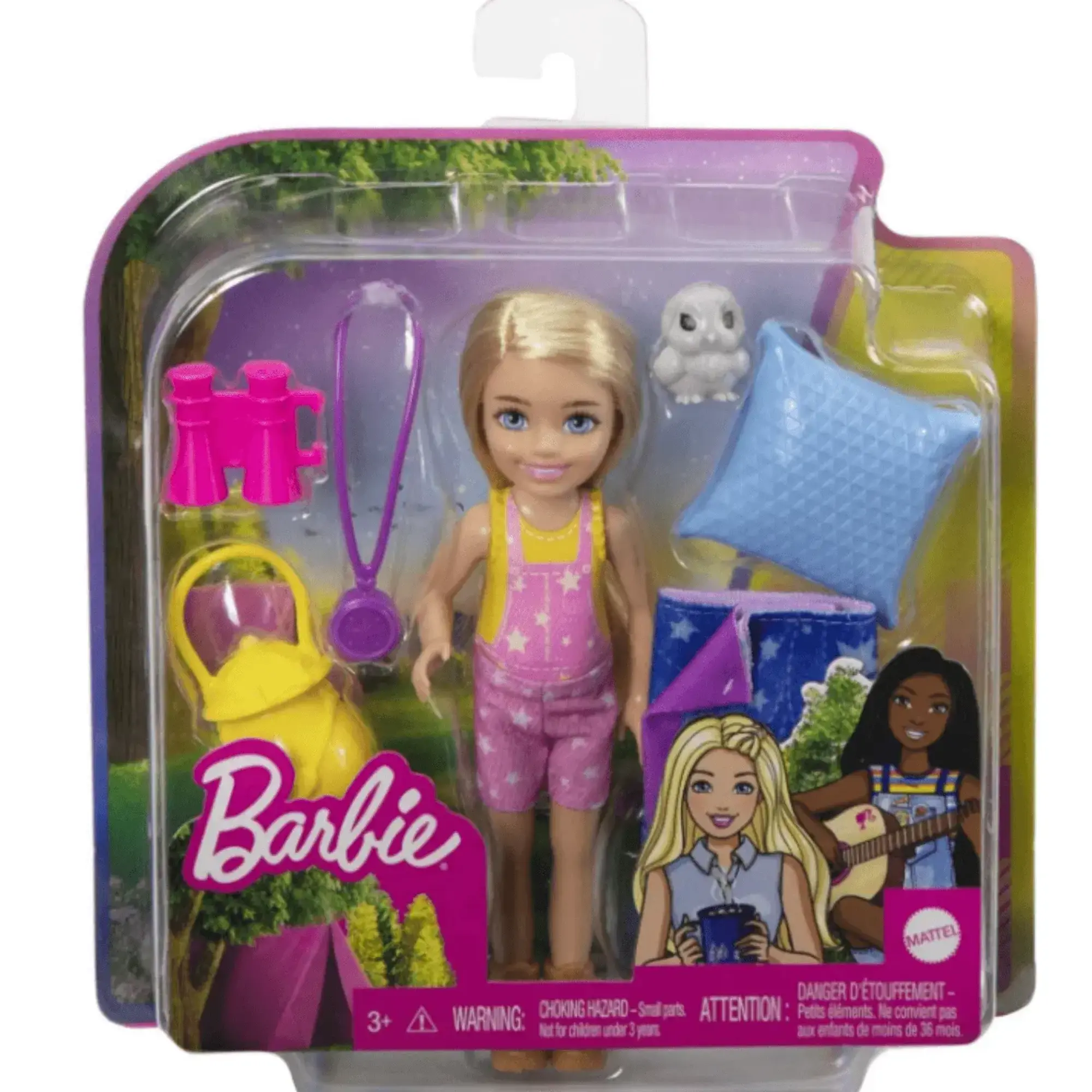 Barbie Chelsea'nin Kamp Macerası Oyun Seti (15 cm, sarışın), hayvan arkadaşı baykuş, uyku tulumu, dürbün ve kamp aksesuarları.