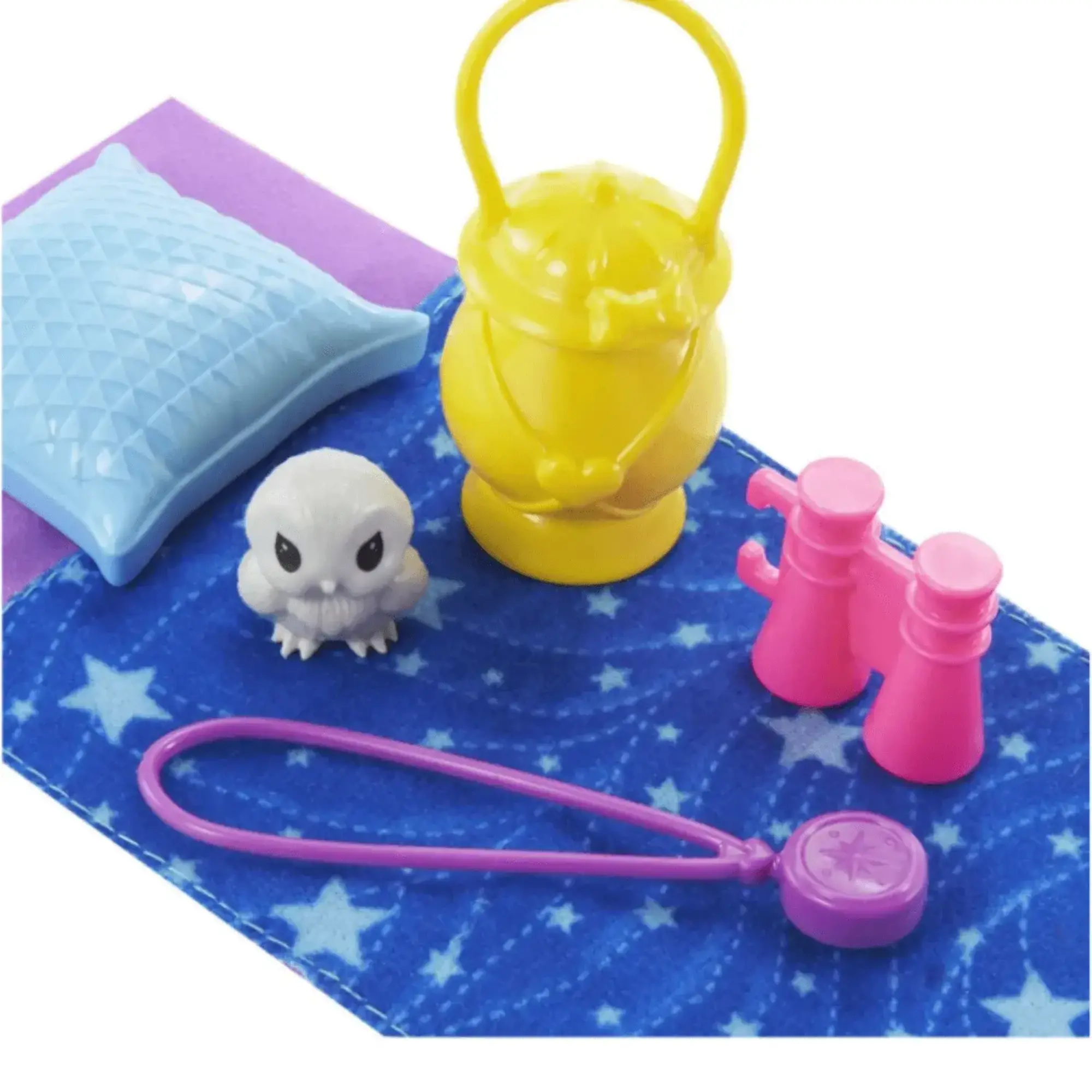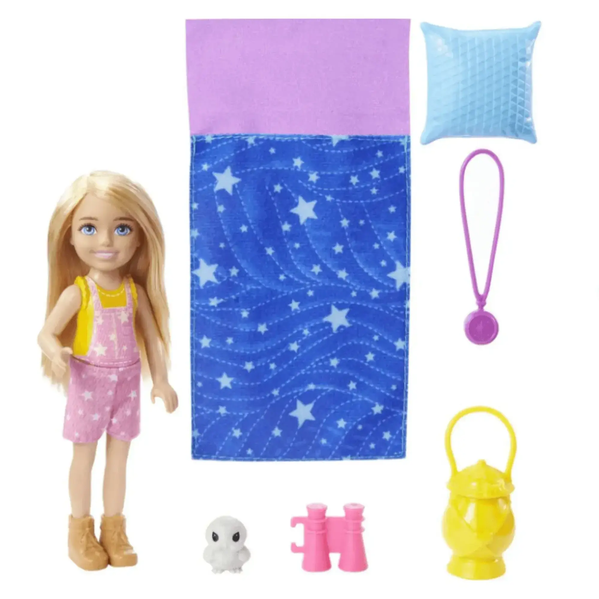 Bahçıvan tulumu ve ayakkabı giyen Chelsea™ Bebek (15 cm), 1 adet baykuş figürü, 1 adet uyku tulumu, 1 adet yastık, 1 adet pusula, 1 adet dürbün ve 1 adet fener içerir.