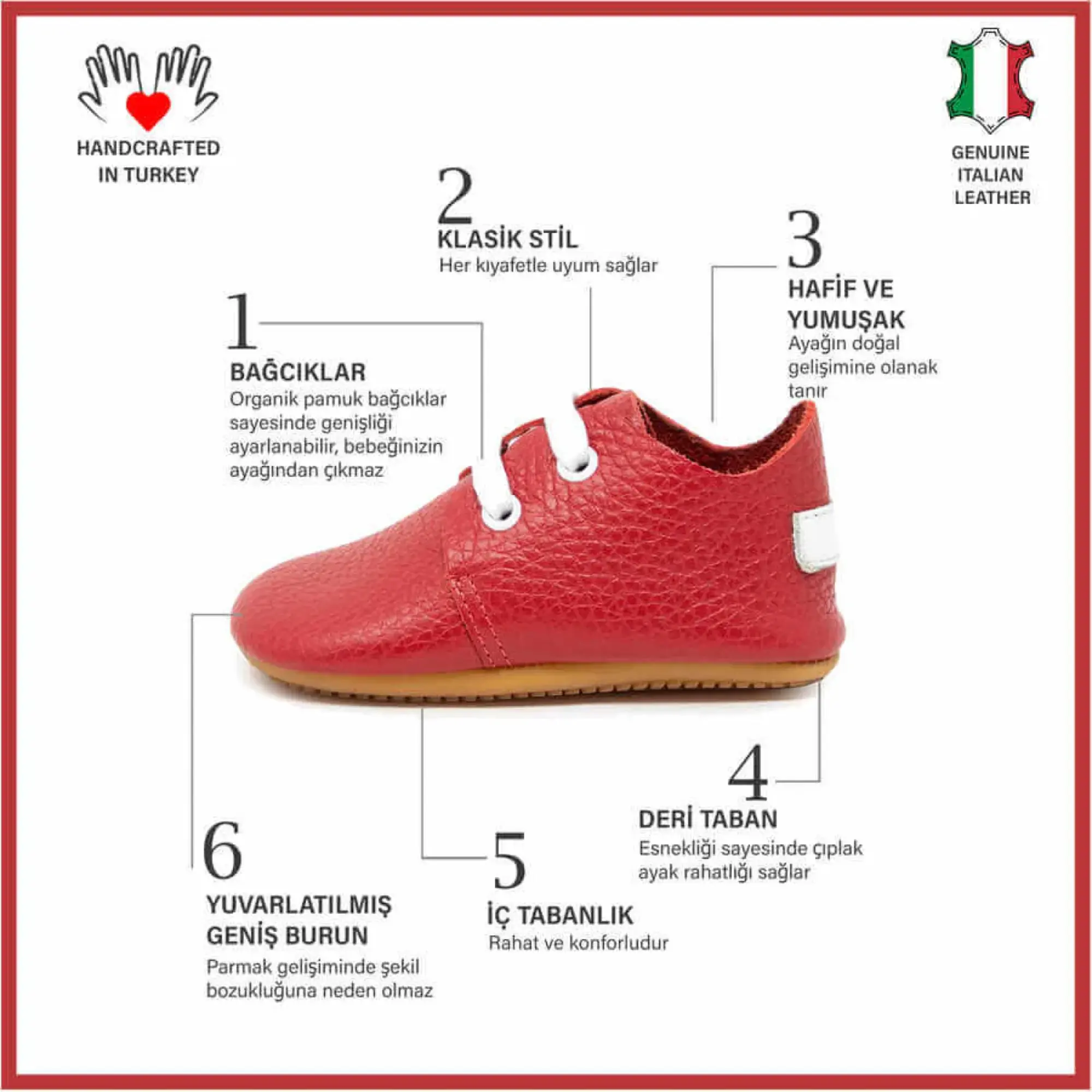 - Ella Bonna İlk Adım Bebek taneleri %100 Hakkı Deri ve hiç kimyasal içermeyen doğal malzemeler kullanınarak üret.