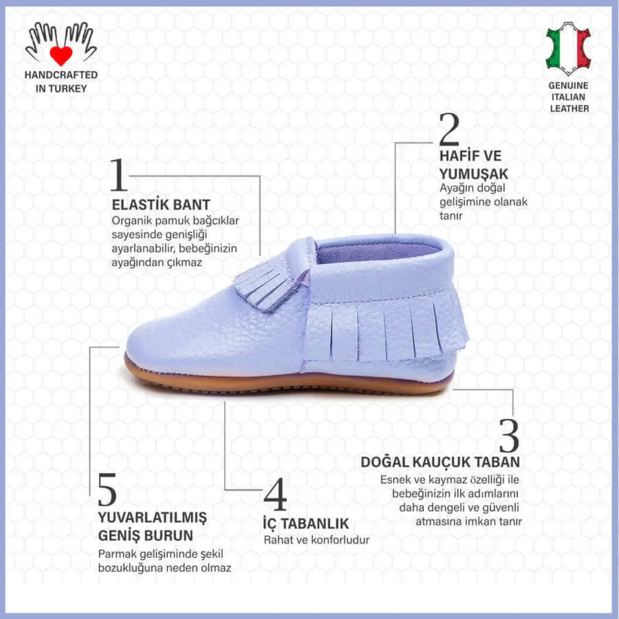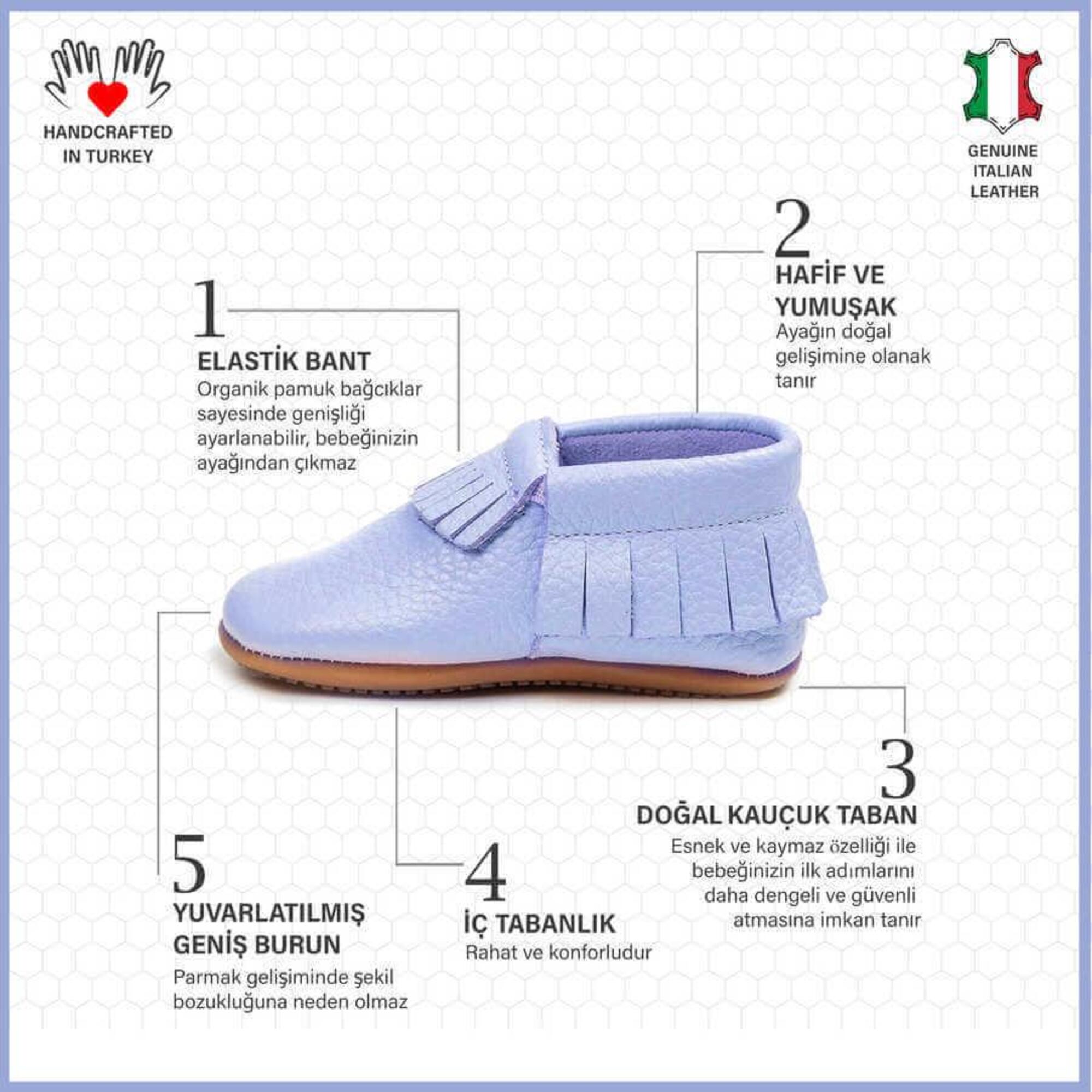 - Tüm bebek ayakkabı modellerimiz minik kızınızın / oğlunuzun ayak sağlığından ödün vermeden şıklığını tamamlaması için sadece özel olarak gerçek deriden, ve doğal malzemeler görüntüleme en usta ellerde ve gururla TURKIYE'de üretilmektedir.