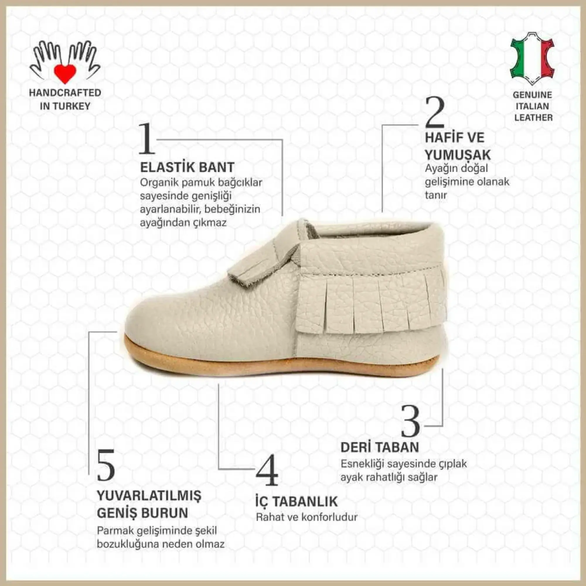- Tüm bebek ayakkabı modellerimiz minik kızınızın / oğlunuzun ayak sağlığından ödün vermeden şıklığını tamamlaması için sadece özel olarak gerçek deriden, ve doğal malzeme görüntüleme en usta ellerde ve gururla TURKIYE'de üretilmektedir.