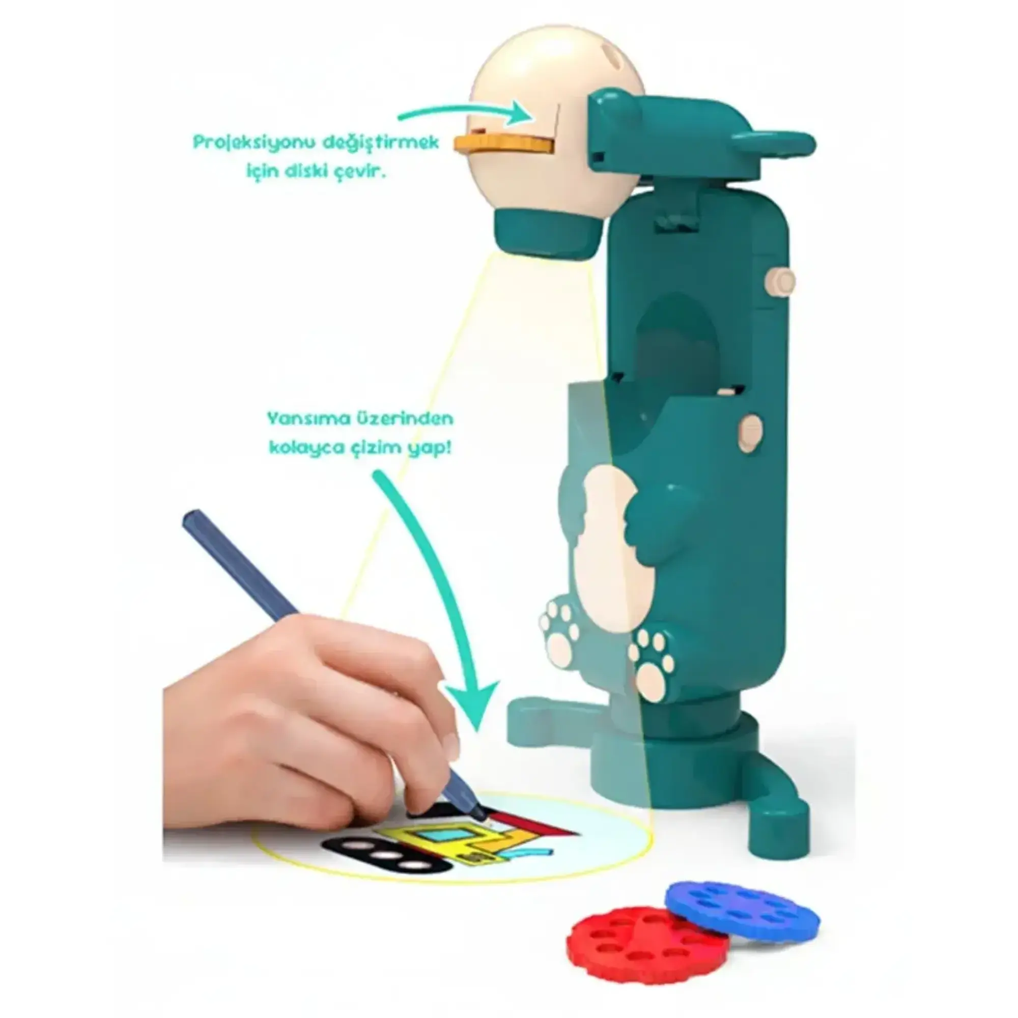 - Bu projeksiyonlu çizim cihazı, 6 farklı renkli slayt diski ile birlikte gelir.
