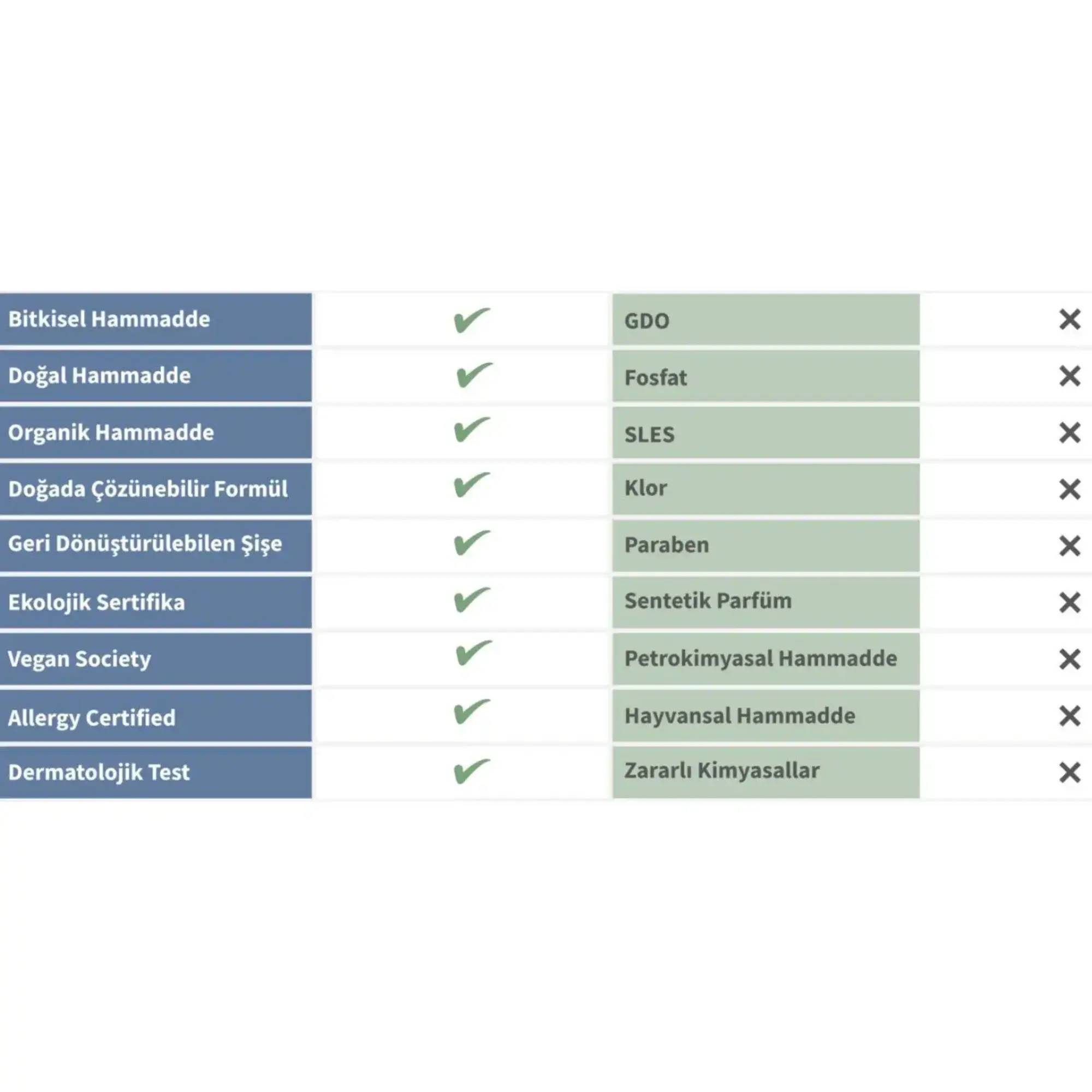 GDO, fosfat, SLES, klor, paraben, sentetik parfüm, petrokimyasal, hayvansal hammadde kesinlikle içermez. Vegan Society belgesine sahiptir.