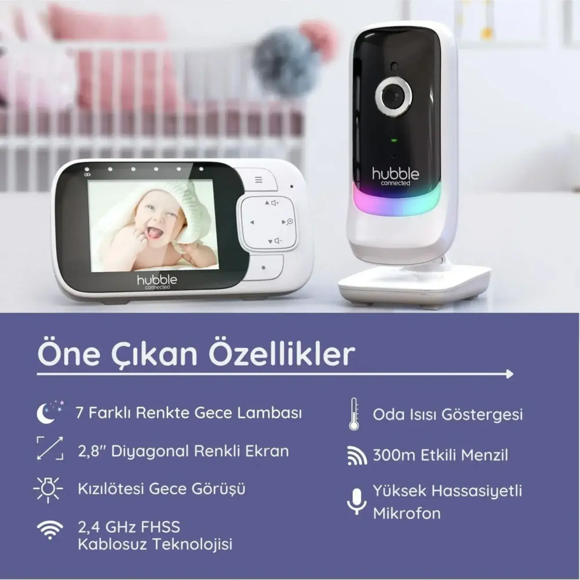 - Hubble Nursery View Glow 2.8" Gece Lambalı Dijital Bebek Kamerası Hubble Nursery View Glow, bebeğinizin odasından gerçek zamanlı video ve ses gösteren, sizi hem görsel hem de işitsel olarak neler olup bittiği hakkında bilgilendiren 2,8 inçlik renkli bir LCD ekrana sahiptir.