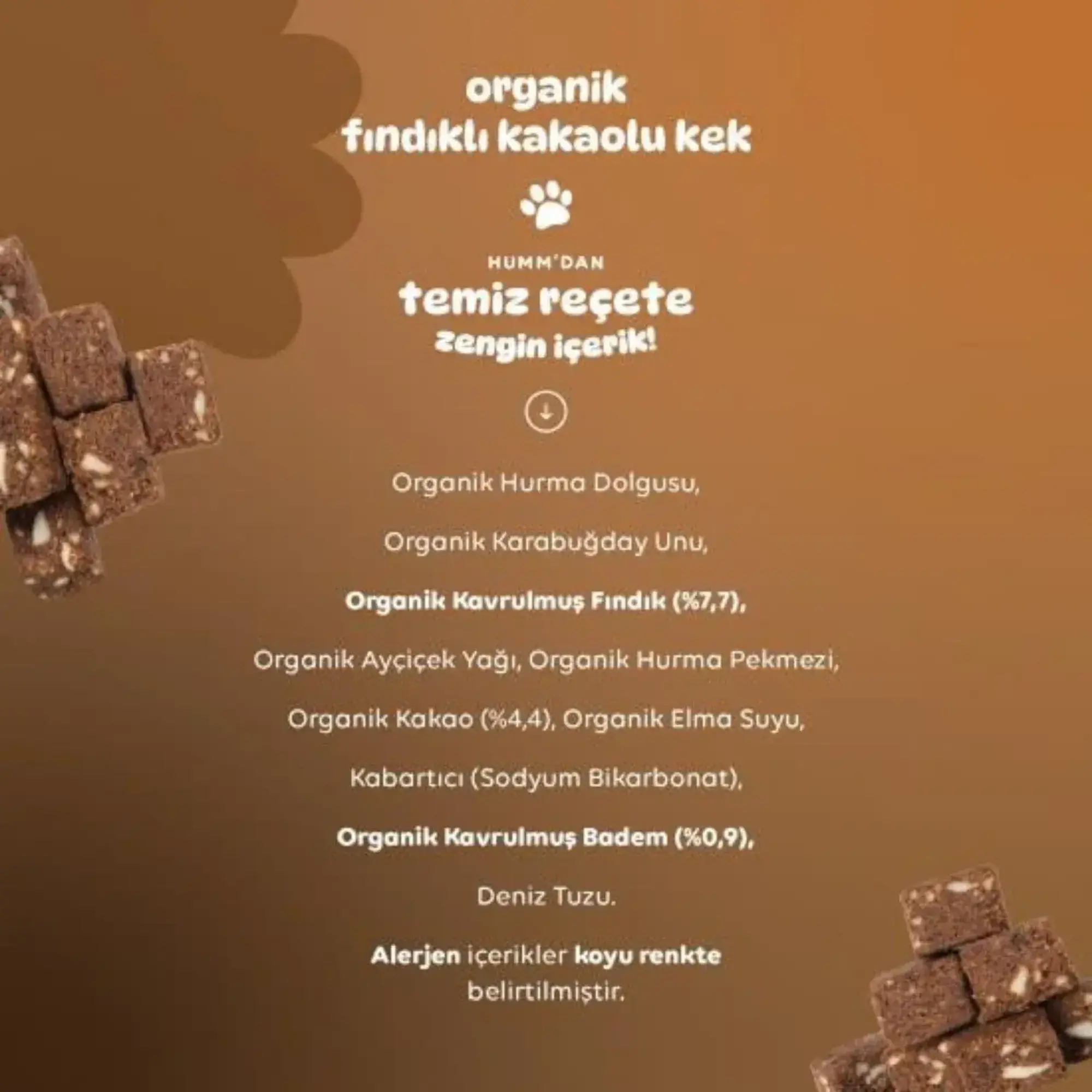 Humm Organic markasının Organik Glutensiz Vegan Kakaolu ve Fındıklı Kek'i, lezzetli bir atıştırmalık veya tatlı seçeneği sunar. Bu vegan kek, organik içeriklerle üretilmiş ve glutensizdir. İçerisinde organik kakao, hurma dolgusu, kavrulmuş fındık, kakao ve diğer özel malzemeler bulunur, bu sayede tatlı bir lezzet sunar. Renklendirici ve ilave şeker içermez; doğal olarak şeker içerir. Her yaşta sağlıklı, glutensiz ve mükemmel browni lezzetini yaşamak isteyenlere!