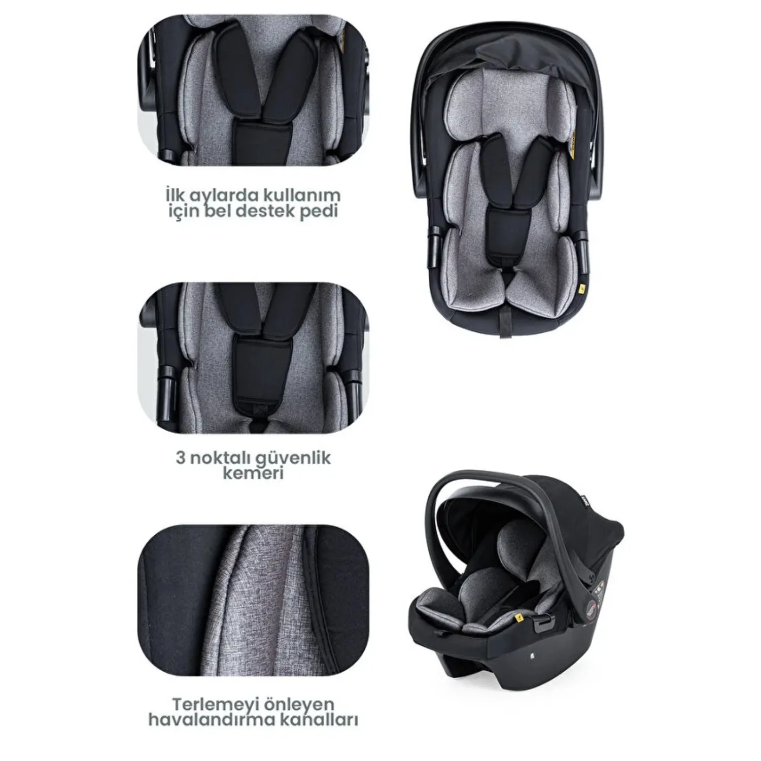 - Taşıma koltuğu, ana kucağı ve oto koltuğu olarak kullanabilme