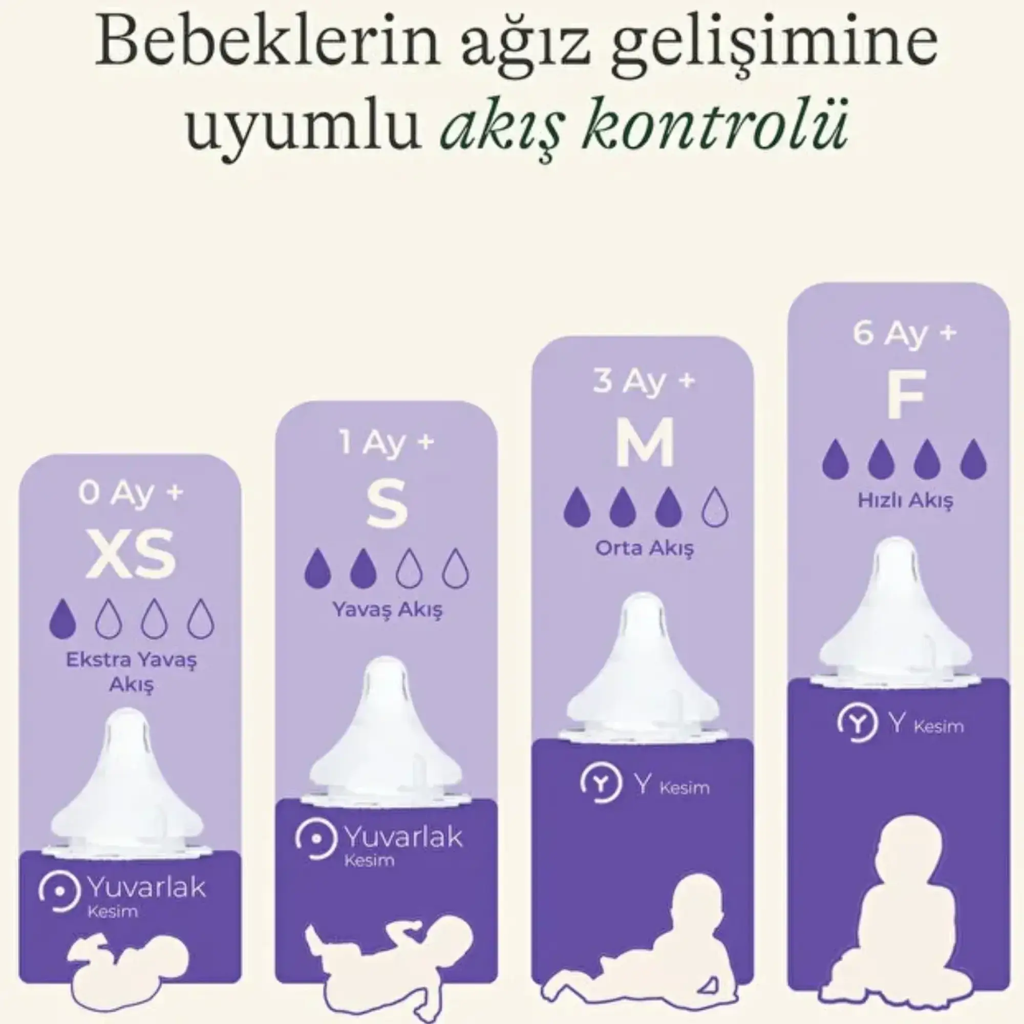 F (Hızlı) akış: 6 ay ve üstü bebeklerin kullanımına uygun şekilde tasarlanmıştır. Daha güçlü emme refleksine sahip, süt akışını kontrol edebilecek bebek ve küçük çocukları destekler. Emzik ucu çapraz kesimdir.
