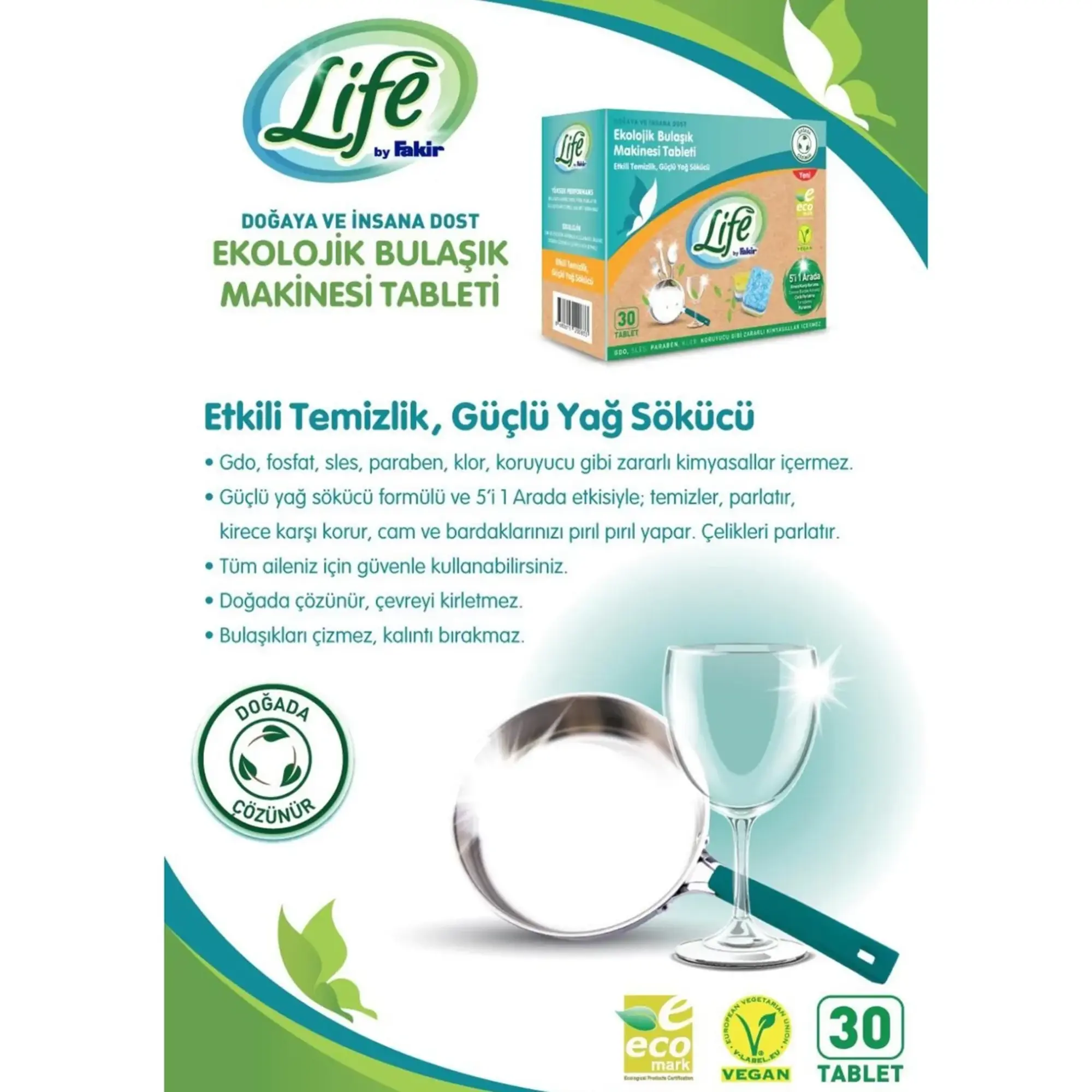 • Life by Fakir Ekolojik Bulaşık Makinesi Tablet Deterjanı ,GDO, Fosfat,SLES,Paraben,Klor,koruyucu gibi zararlı kimyasallar içermez