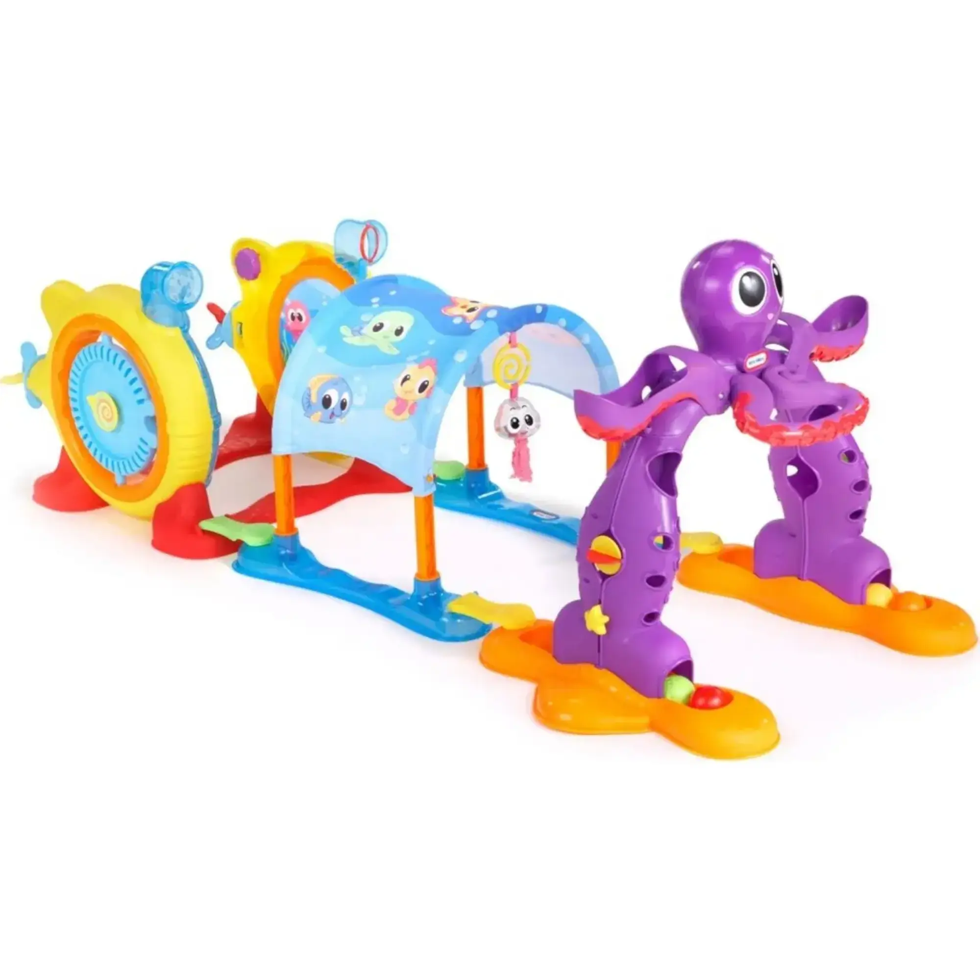 - Ahtapot oyun platformu: bebek ayakta durduğunda tutup çekme kolları, topu bırakma, tıkaçlar, döndürücüler, ödüllendirici sesler ve cümleler!