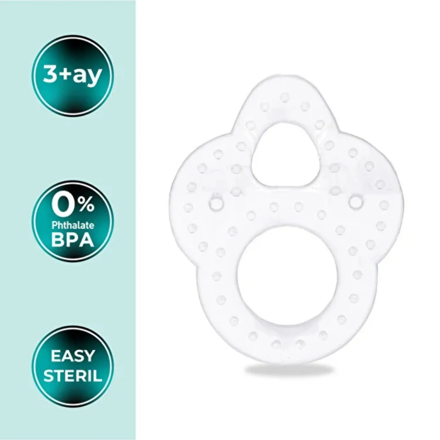 Kabartılı yüzeyi ve halkalı tasarımıyla hem diş etlerini rahatlatır hem de ince motor gelişimini destekler.