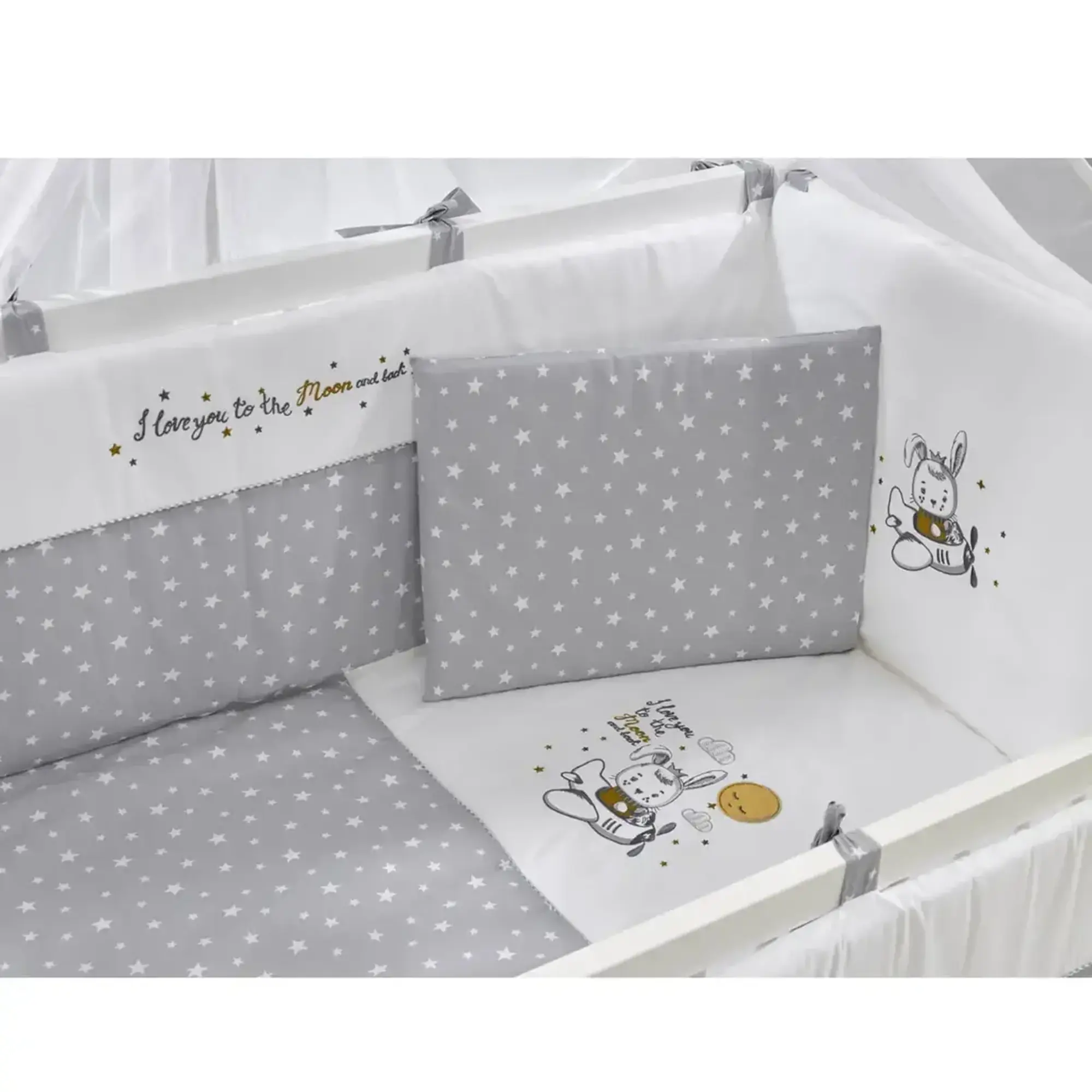 OEKO-TEX Sertifikalı 9 Parçalı Uyku Seti: Yumuşacık pamuklu kumaştan üretilmiştir. 1 adet yorgan, 1 adet çarşaf, 1 adet yastık kılıfı, 1 adet nakışlı yastık kılıfı, 1 adet fermuarlı kısa kenar koruma, 2 adet fermuarlı uzun kenar koruma, 1 adet cibinlik tülü, 1 adet cibinlik aparatı