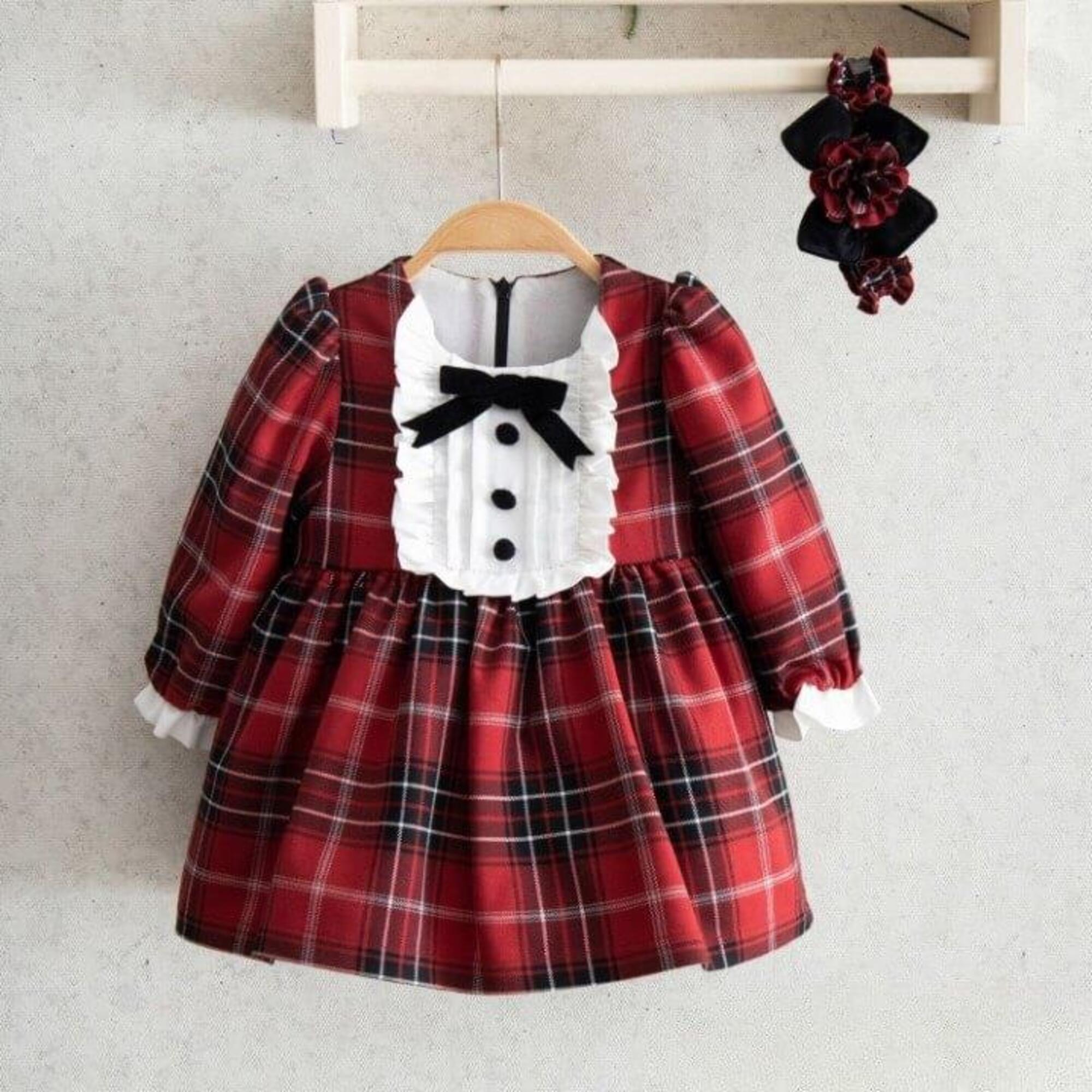 Miomini Elbise Saç Bantlı Fiyonklu Ekose Kadife Şeritli