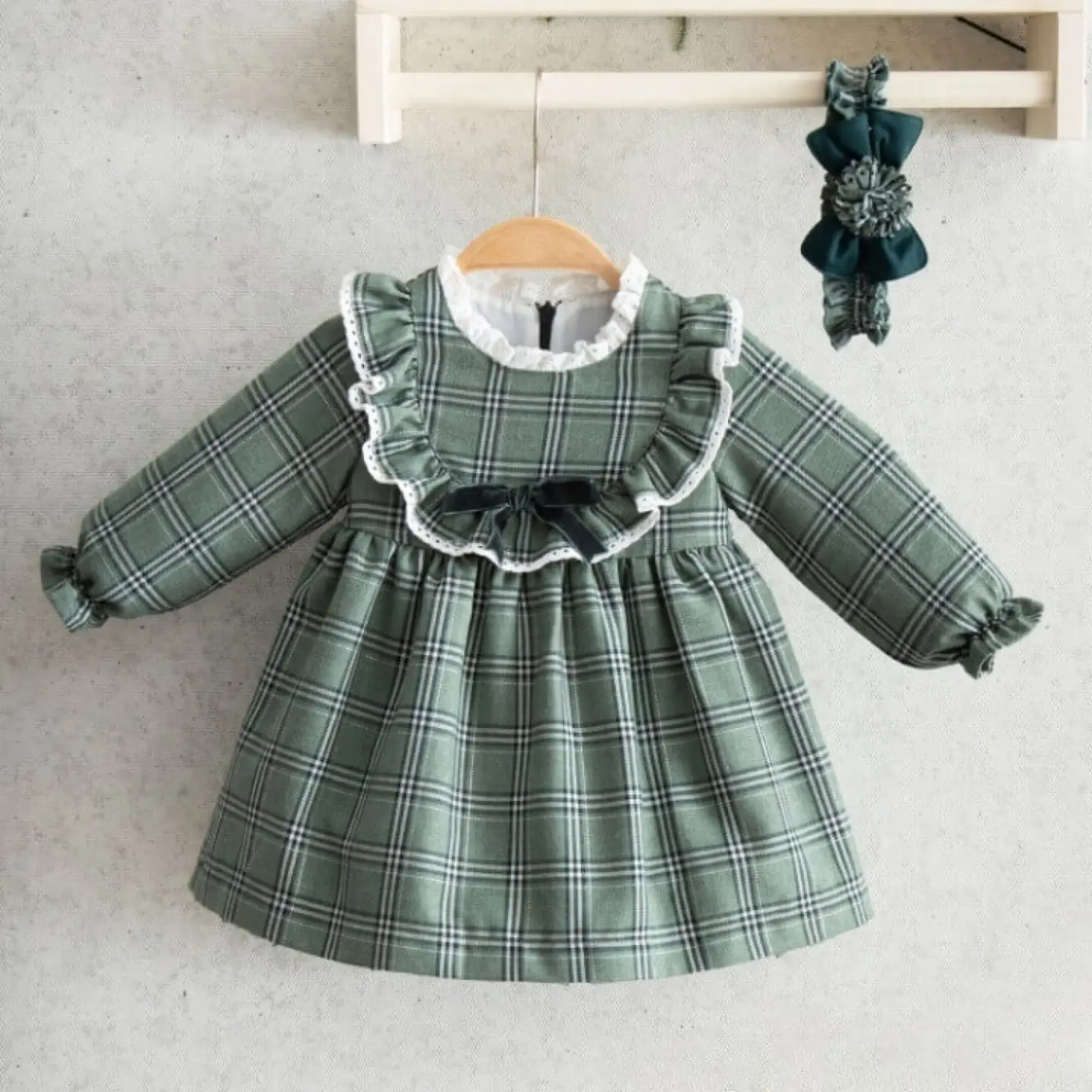 Miomini Elbise Saç Bantlı Simli Ekose Fırfırlı Robalı Yeşil