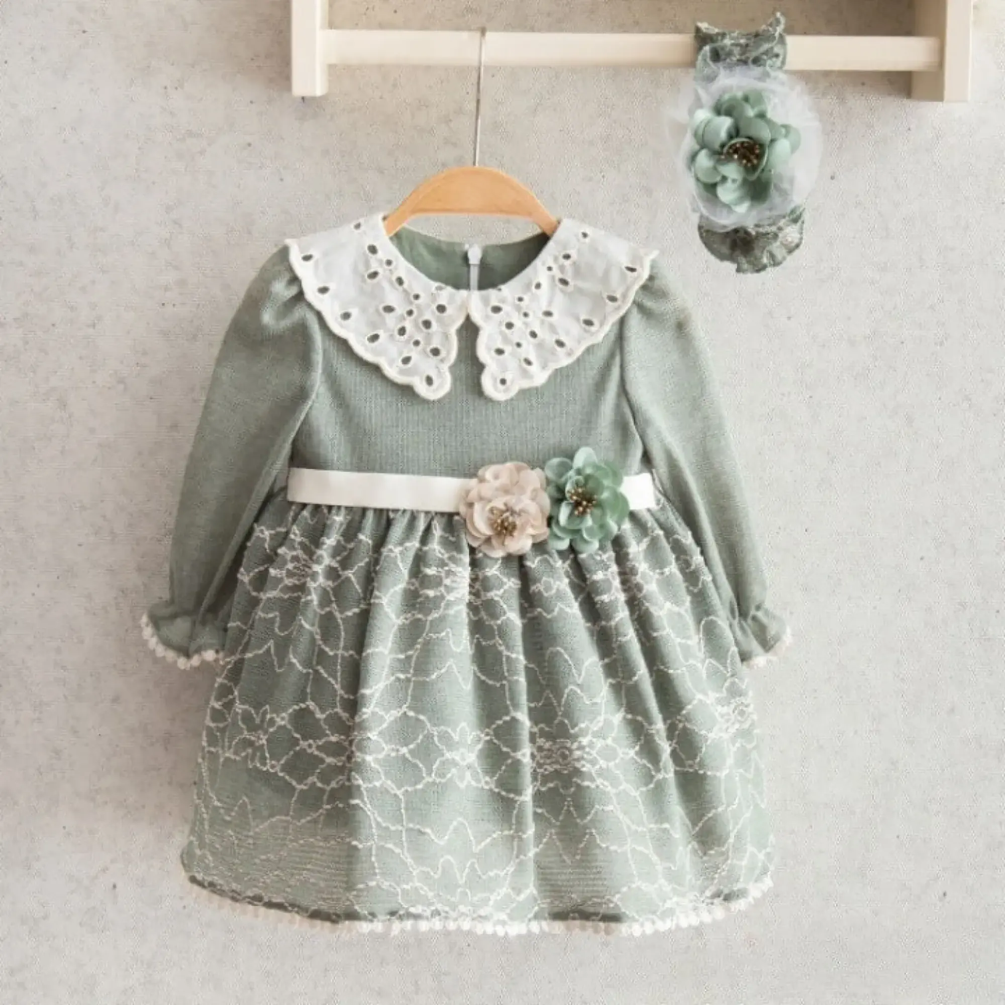 Miomini Elbise Saç Bantlı Triko Çiçek Kemerli Yeşil