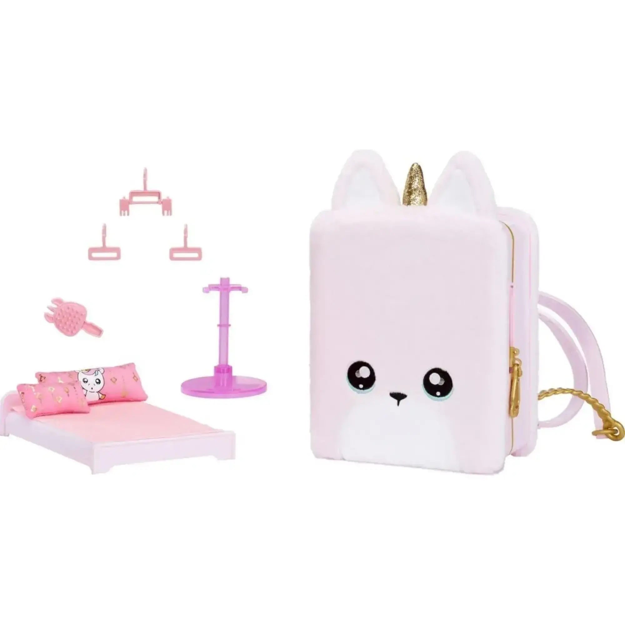 Muhteşem sırt çantası yumuşak ve tüylüdür ve moda bebeklerinin tek boynuzlu at stiline tamamen uyan bir kişiliğe sahiptir. Açıldığında katlanabilir yatağı, çalışma çekmeceli dolabı, yastıkları, battaniyesi ve askıları olan, hepsi sevimli, tek boynuzlu at detaylarına sahip bir yatak odası oyun seti ortaya çıkar.