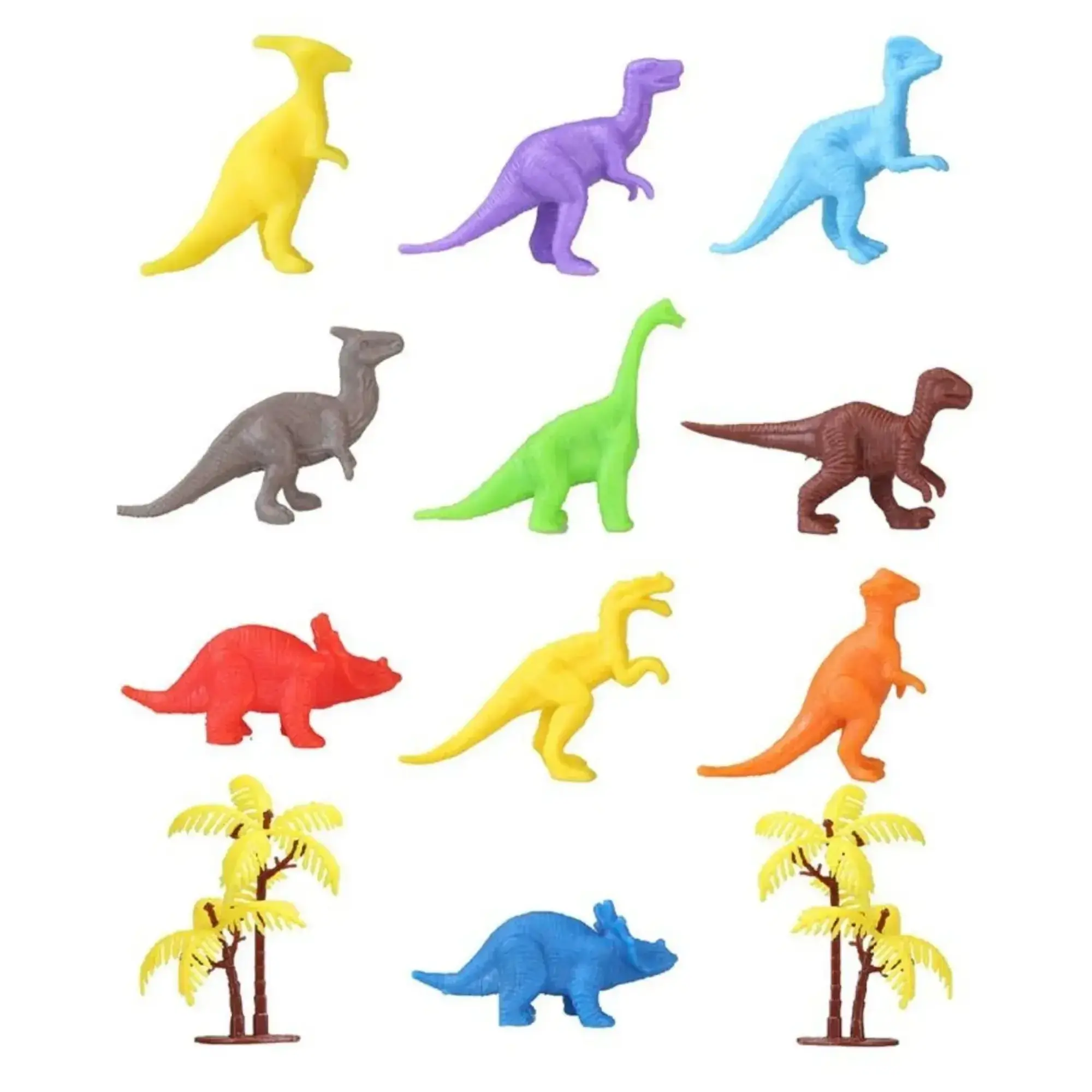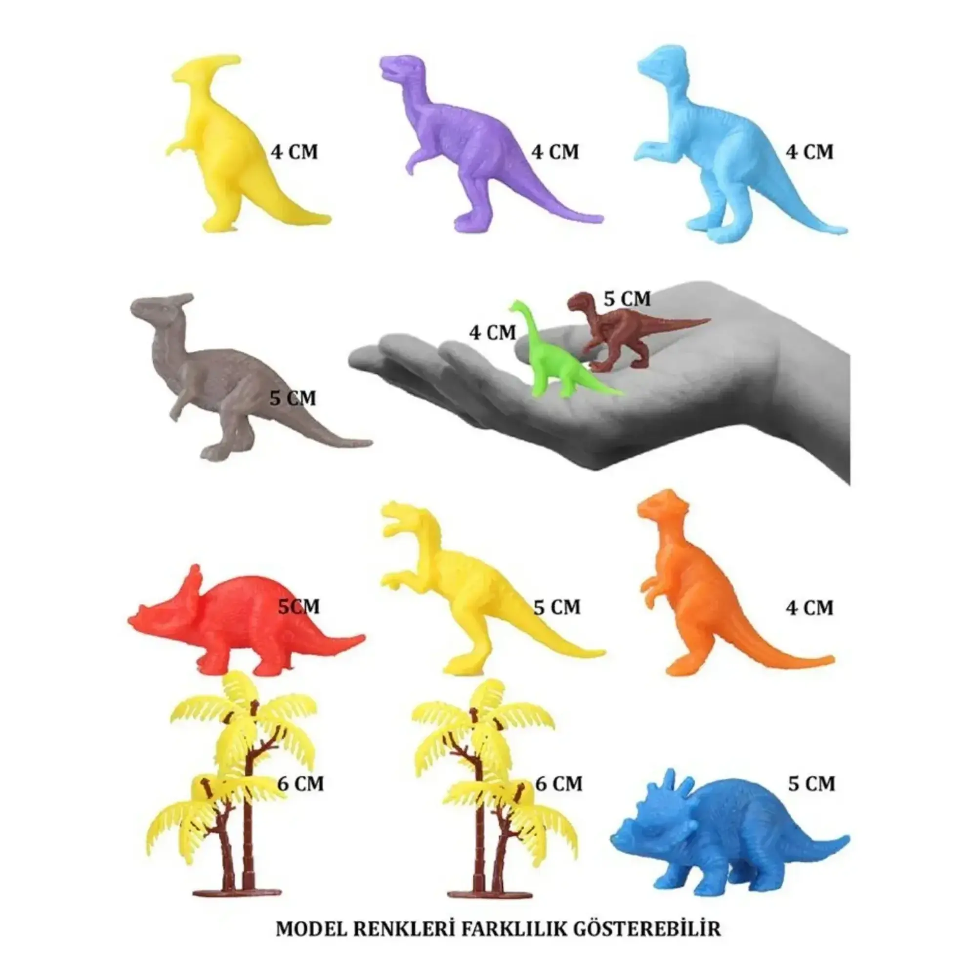 Bu set, 10 adet minik renkli dinozor figürü ve 2 adet ağaç aksesuarından oluşmaktadır. Her bir figürün boyutları 4 ila 6 cm arasındadır. Dinozor figürleri çeşitli renklerde bulunmaktadır, bu sayede çocuklar farklı renkleri keşfedebilir ve hayal güçlerini kullanarak oyunlarını daha eğlenceli hale getirebilirler.