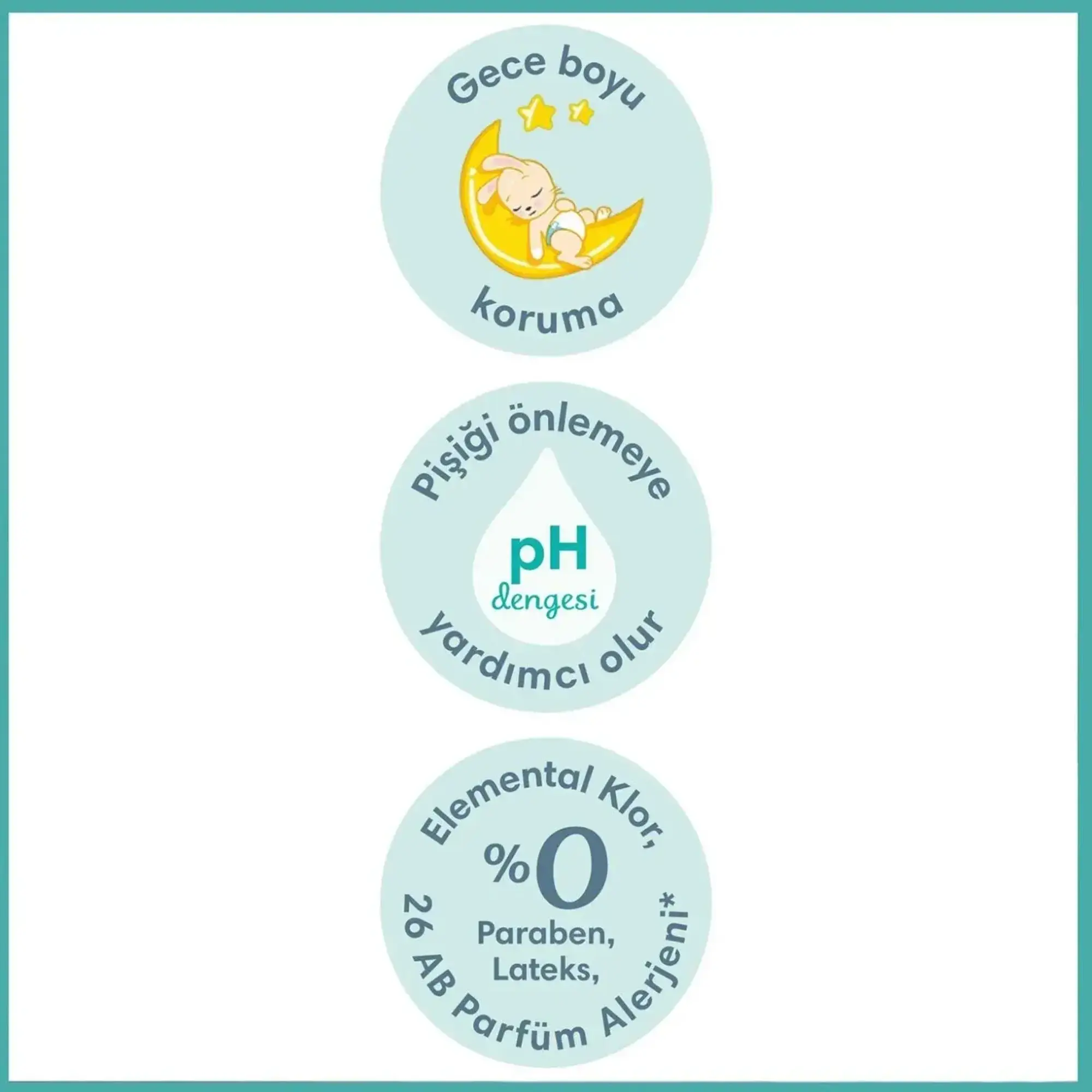 - Üç Emici Kanal: Islaklığı bebek bezinde eşit olarak dağıtmaya yarar.