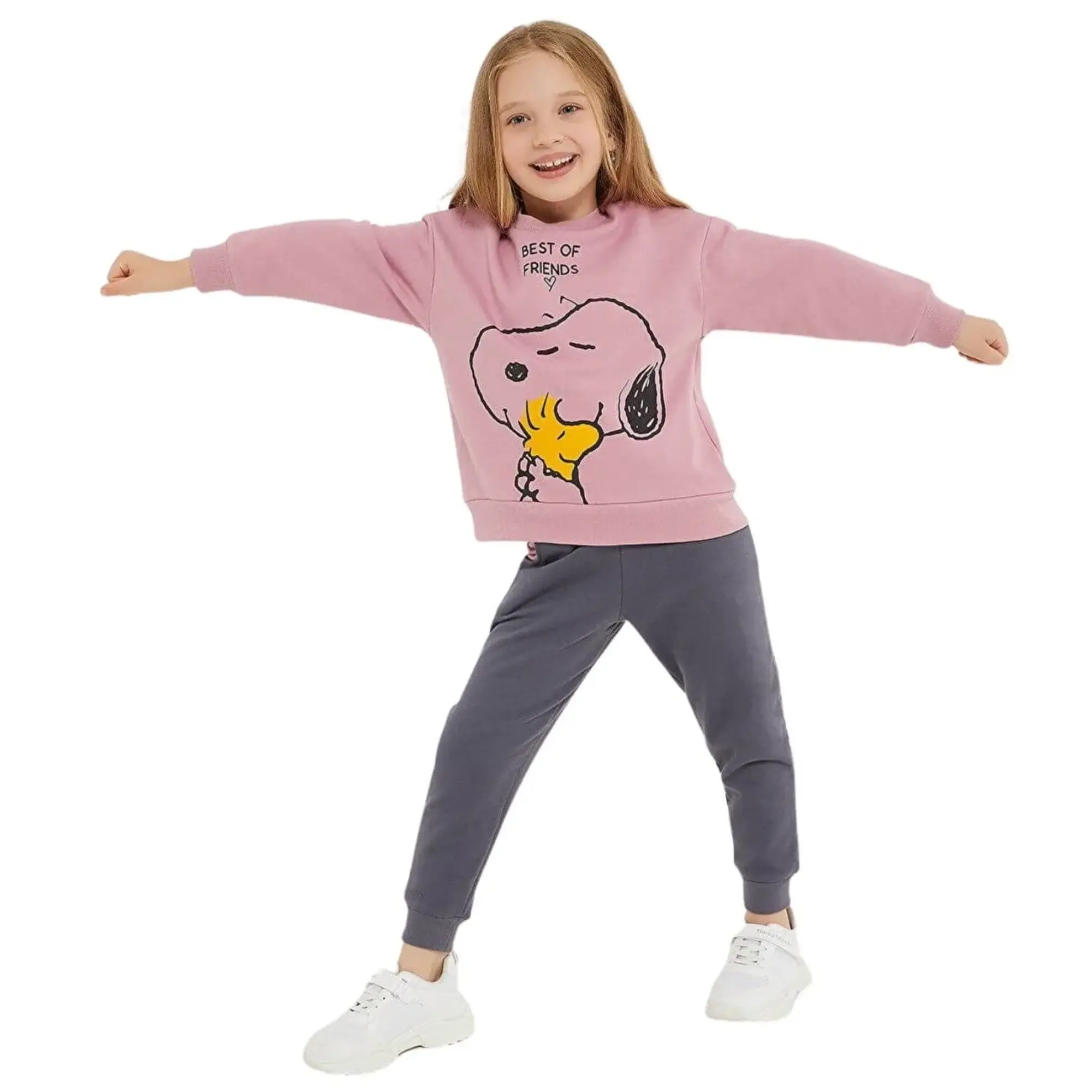 Snoopy Lisanslı Best Of Friends Leylak Kız Çocuk Eşofman Takım, çocukların sevimli çizgi film karakterlerinden biri olan figürle eşofman üstünü süslerken, eşofman altında ise cep de kullanılan renk ile uyumu ile bütünlük sağlar.